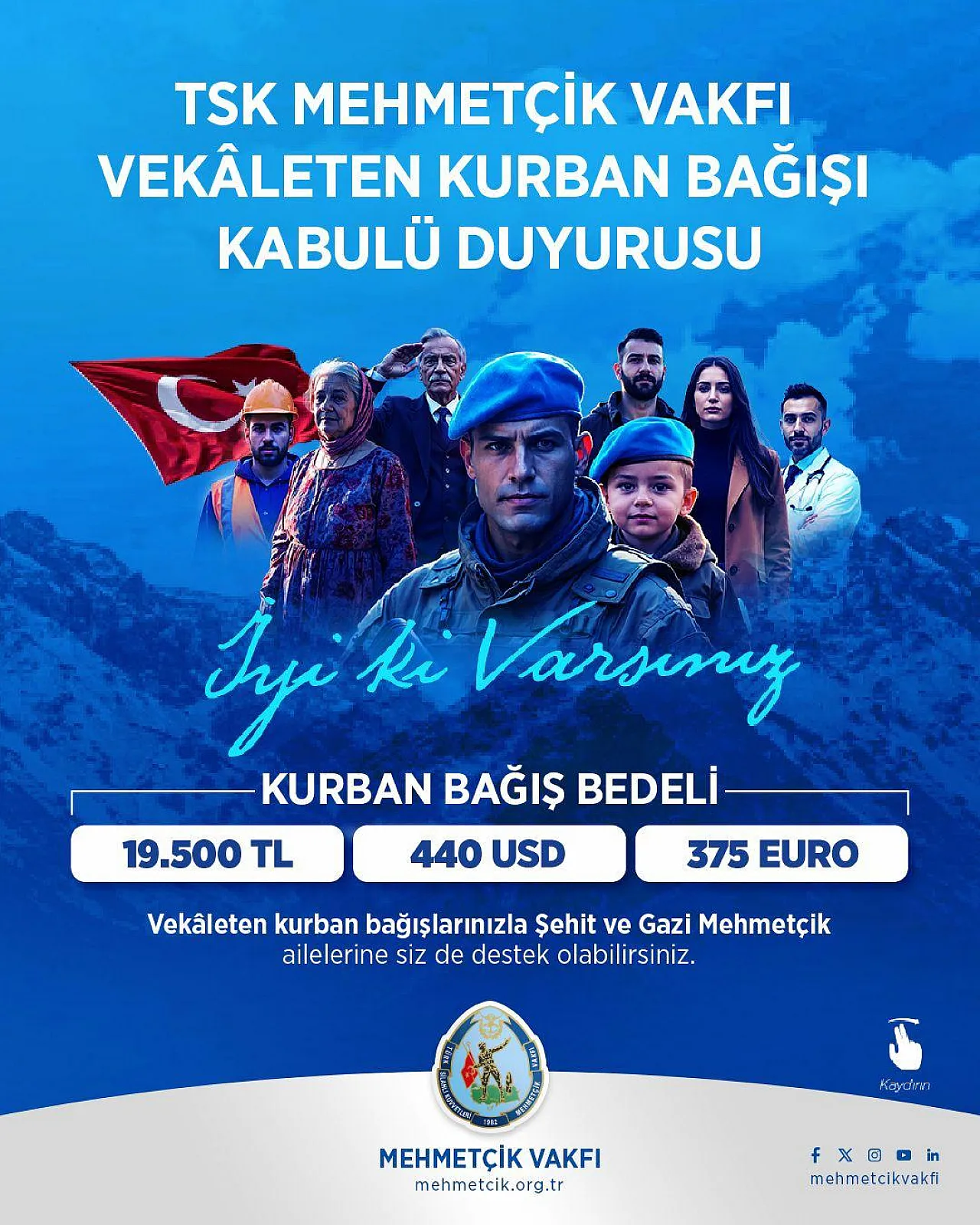 TSK Mehmetçik Vakfı, 2026 yılı vekâleten kurban bağışı kabulüne 27 Nisan itibarıyla başladığını duyurdu. Vakıf, bir hisse bedelini 19 bin 500 lira, 440 ABD doları ve 375 avro olarak belirledi.