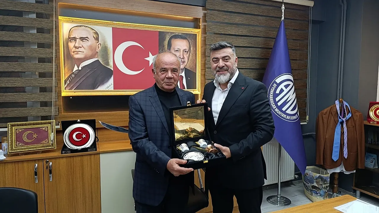Afyonkarahisar Muhtarlar Derneği Başkanı Suat Uygur, Dervişpaşa Mahallesi'nde 9 dönemdir yani yaklaşık 40 yıldır muhtarlık yapan Muhtar Mehmet Vedat Boztay’ı ziyaret etti. Başkan Uygur, ziyaretinde Boztay'a vefa plaketi verdi.