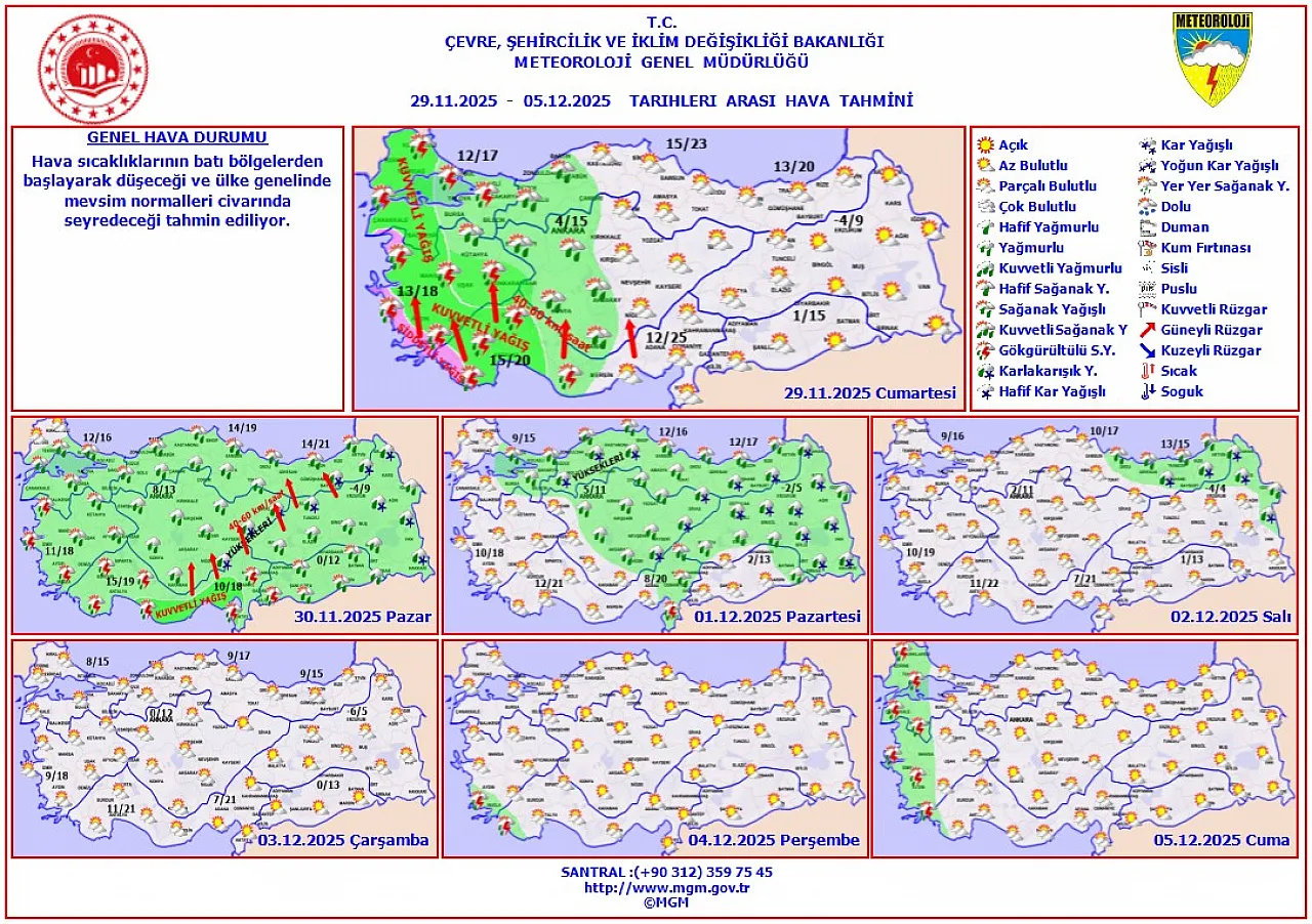 Meteoroloji Genel Müdürlüğü tarafından yapılan tahminlere göre ülkemiz genelinin parçalı, yer yer çok bulutlu, Marmara, Ege ve Batı Akdeniz ile İç Anadolu'nun batısının sağanak ve gök gürültülü sağanak yağışlı geçeceği tahmin ediliyor.