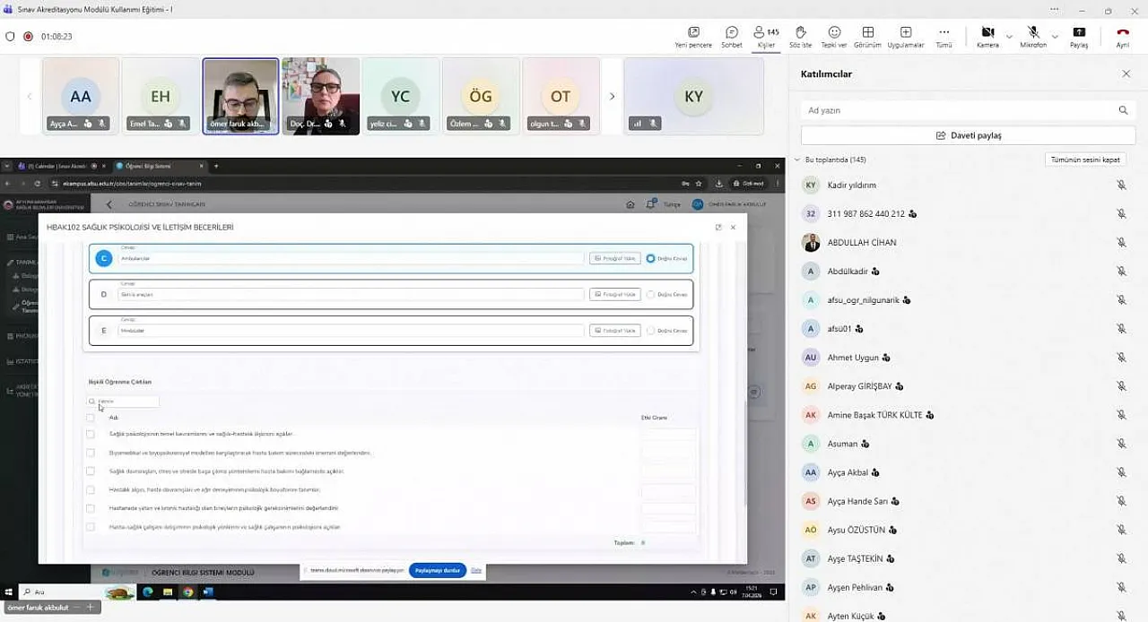 Akademisyenlerin katılımıyla çevrim içi düzenlenen “Sınav Akreditasyonu Modülü Kullanımı Eğitimi-I” başlıklı eğitimde, sınavların oluşturulması, soruların öğrenme kazanımları ile eşleştirilmesi ve sınav sonuçlarının sisteme aktarılması süreçleri, AFSÜ Kalite Koordinatörü Doç. Dr. Öznur Gürlek Kısacık ile Dr. Öğr. Üyesi Ömer Faruk Akbulut ve Dr. Öğr. Üyesi Kadir Yıldırım tarafından, uygulamalı olarak anlatıldı.