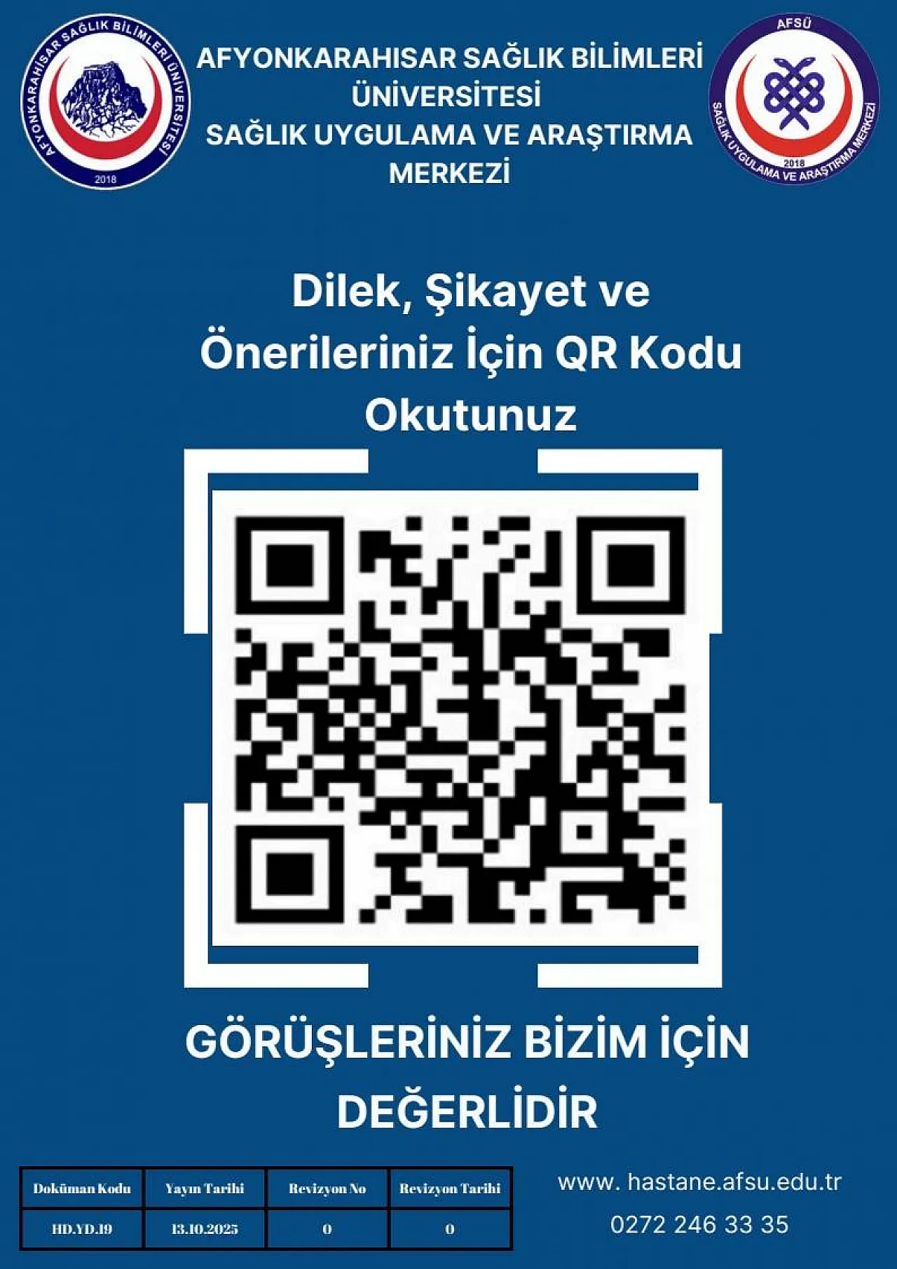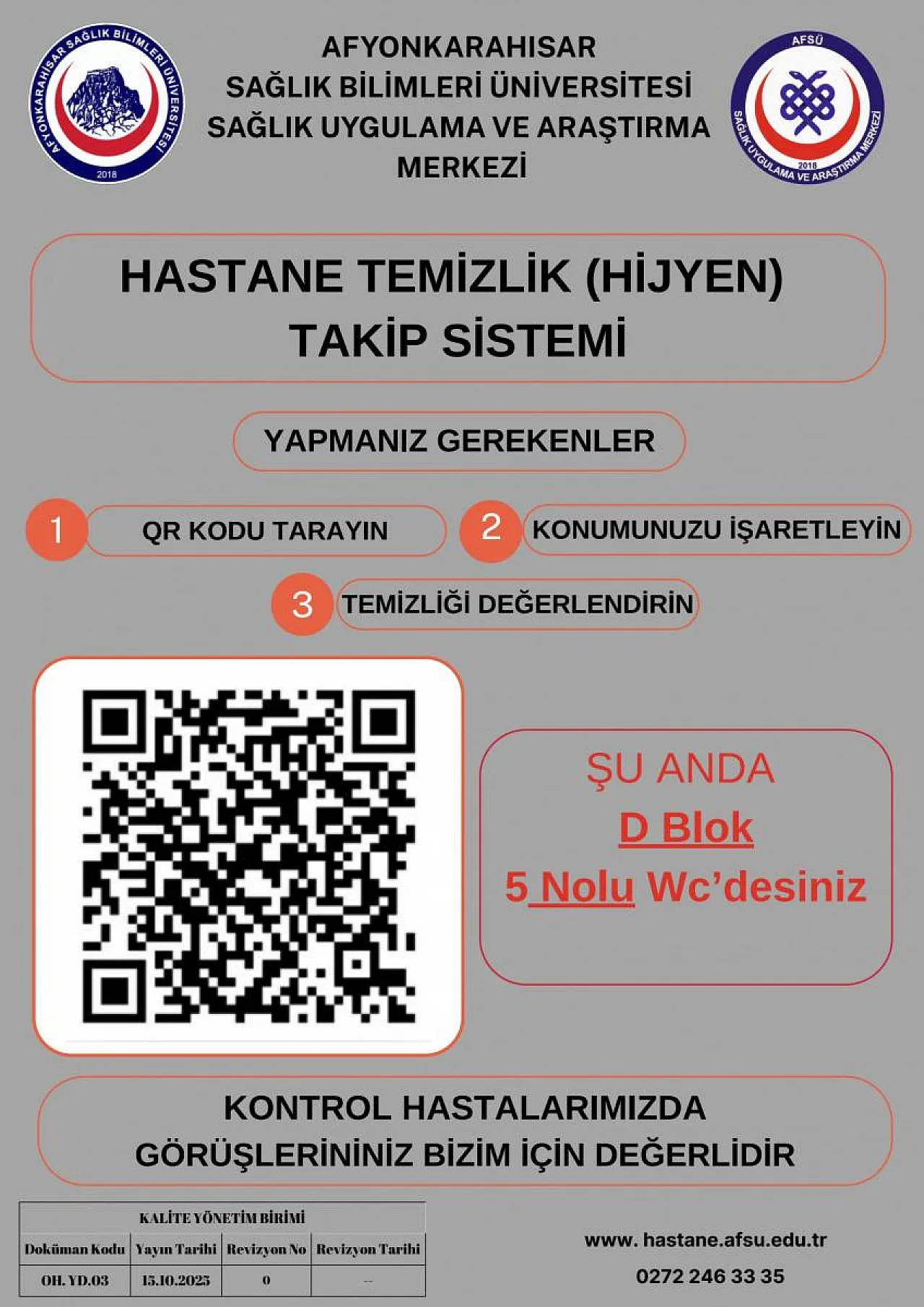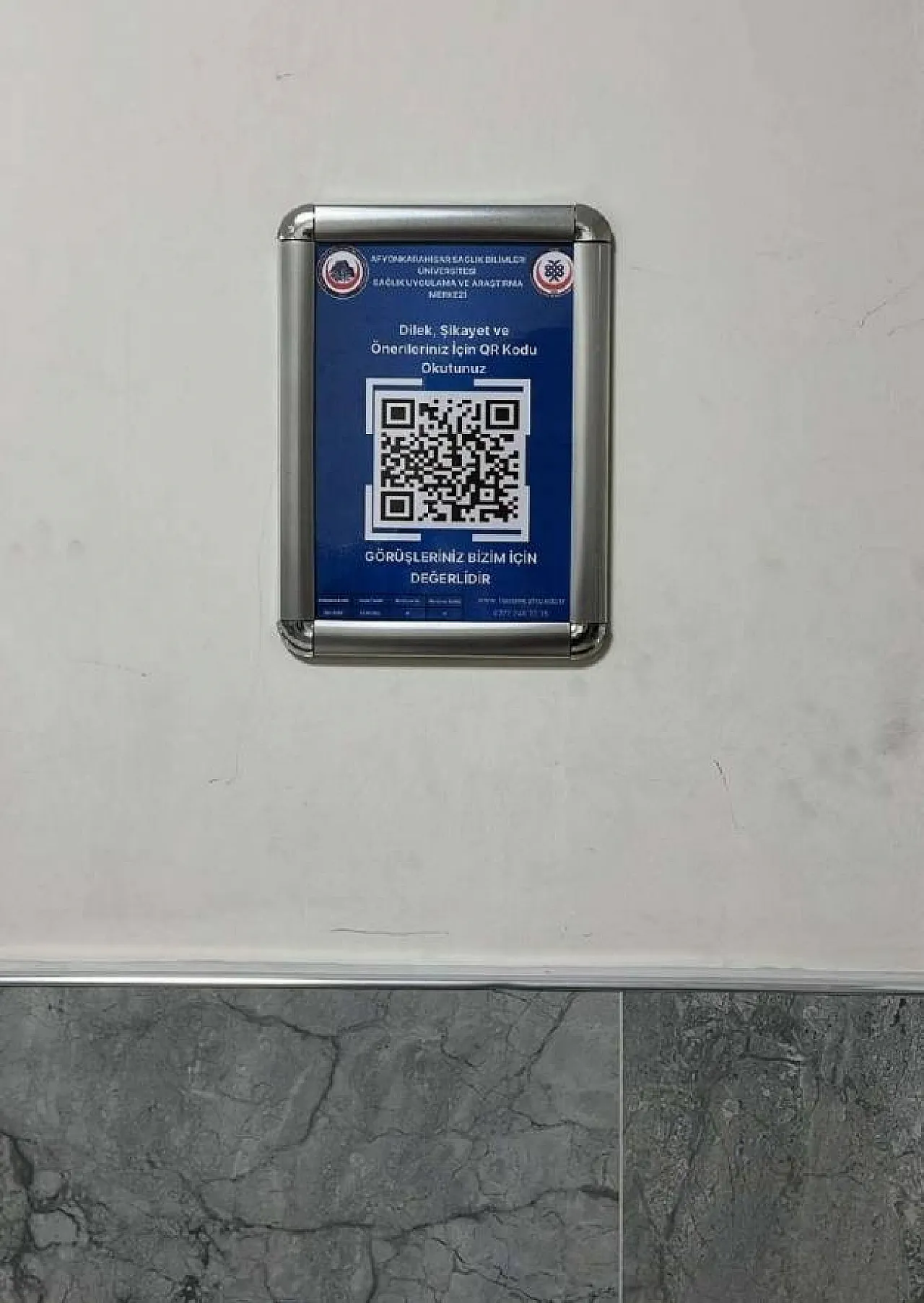 Afyonkarahisar Sağlık Bilimleri Üniversitesi (AFSÜ) Hastanesinde, karekod (QR) destekli “İstek ve Şikâyet Bildirim Sistemi” ile “Tuvalet Temizliği Değerlendirme Sistemi” kullanıma sunuldu. Üniversiteden sağlık hizmeti alan herkesin memnuniyetini artırmak amacıyla AFSÜ Sağlık Uygulama ve Araştırma Merkezi Kalite Yönetimi Birimi tarafından geliştirilen bu sistemler ile hasta ve hasta yakınları cep telefonları aracılığıyla hızlı bir şekilde geri bildirimde bulunabilecek.