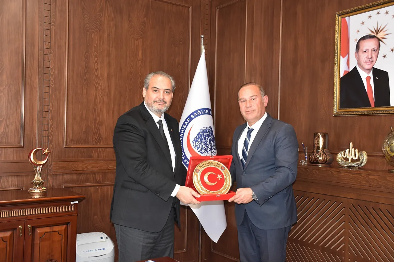 Türk Sağlık-Sen Afyonkarahisar Şube Başkanı ve Türkiye Kamu-Sen İl Temsilcisi Mehmet Ali Öztürk, Afyonkarahisar Sağlık Bilimleri Üniversitesi (AFSÜ) Rektörü Prof. Dr. Adem Aslan'ı makamında ziyaret etti.