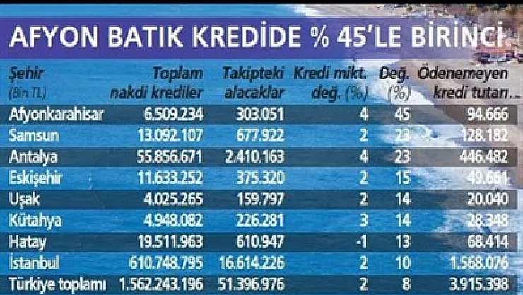 Yılın ilk üç ayına yönelik rakamlarda ilginç bir veri de Afyon, Samsun, Kütahya ve Eskişehir’de artan batık krediler oldu. Afyon’da batık kredi tutarı sadece 3 ayda yüzde 45 gibi rekor düzeye ulaşırken Afyonkarahisar ve Samsun’da firmaların iflas erteleme talebinin rakamı artırdığı söyleniyor.