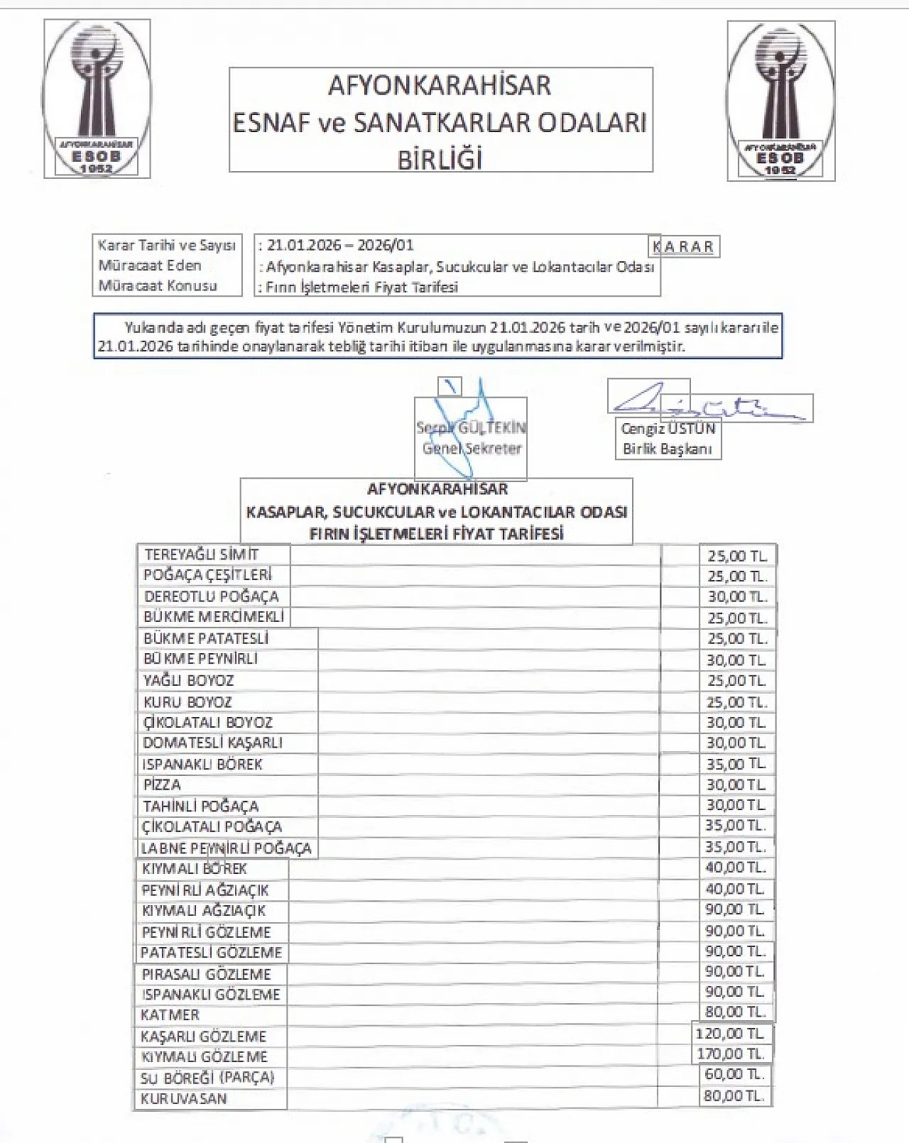 Afyonkarahisar'da Kasaplar, Sucukçular ve Lokantacılar Odası tarafından fırın işletmelerine ait fiyat listeleri güncellendi. 21 Ocak 2026 tarihi itibariyle yürürlüğe giren yeni fiyatlara göre Afyonkarahisar'da tereyağlı simit 25 TL oldu. Yeni fiyat listesine göre poğaça çeşitleri de 25 TL'den satılacak.