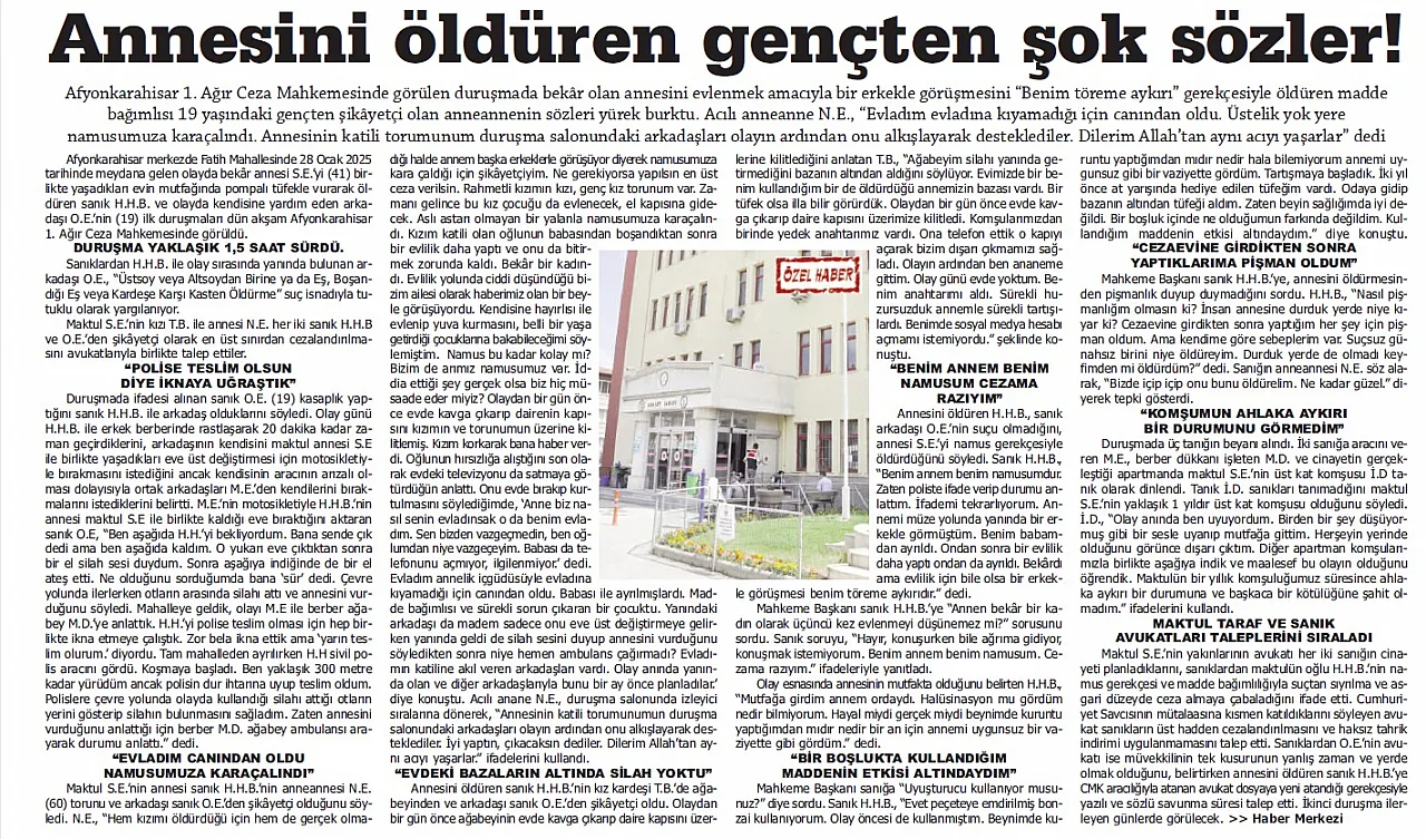 Afyonkarahisar merkezde Fatih Mahallesinde 28 Ocak 2025 tarihinde meydana gelen olayda bekâr annesi S.E.’yi (41) birlikte yaşadıkları evin mutfağında pompalı tüfekle vurarak öldüren sanık H.H.B. ve olayda kendisine yardım eden arkadaşı O.E.K’nın (19) yargılaması tamamlandı.