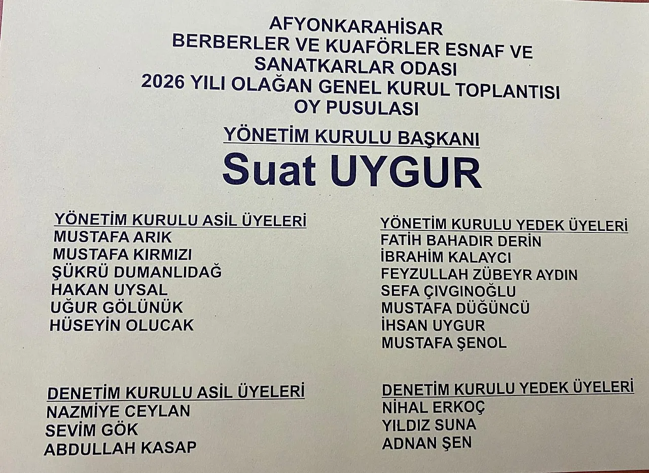 Afyonkarahisar Berberler ve Kuaförler Esnaf ve Sanatkârlar Odası Başkanı ve başkan adayı Suat Uygur yaptığı konuşmada şu ifadeleri kullandı: “Divan Başkanımız Madeni Sanatkârlar Odası Başkanı Sayın Mustafa Yılmazaslan ve yönetimini kutluyorum dün genel kurul ve seçimlerini tamamladılar. Yeniden göreve seçildiler. Sonucu esnaf camiasına hayırlı olmasını diliyorum. Bizde berberlerimiz ve kuaförlerimizle birlikte gece gündüz iş birliği içerisinde çalışıyoruz, çalışmaya devam edeceğiz. Bize sahada görülen eksikler bildiriliyor.