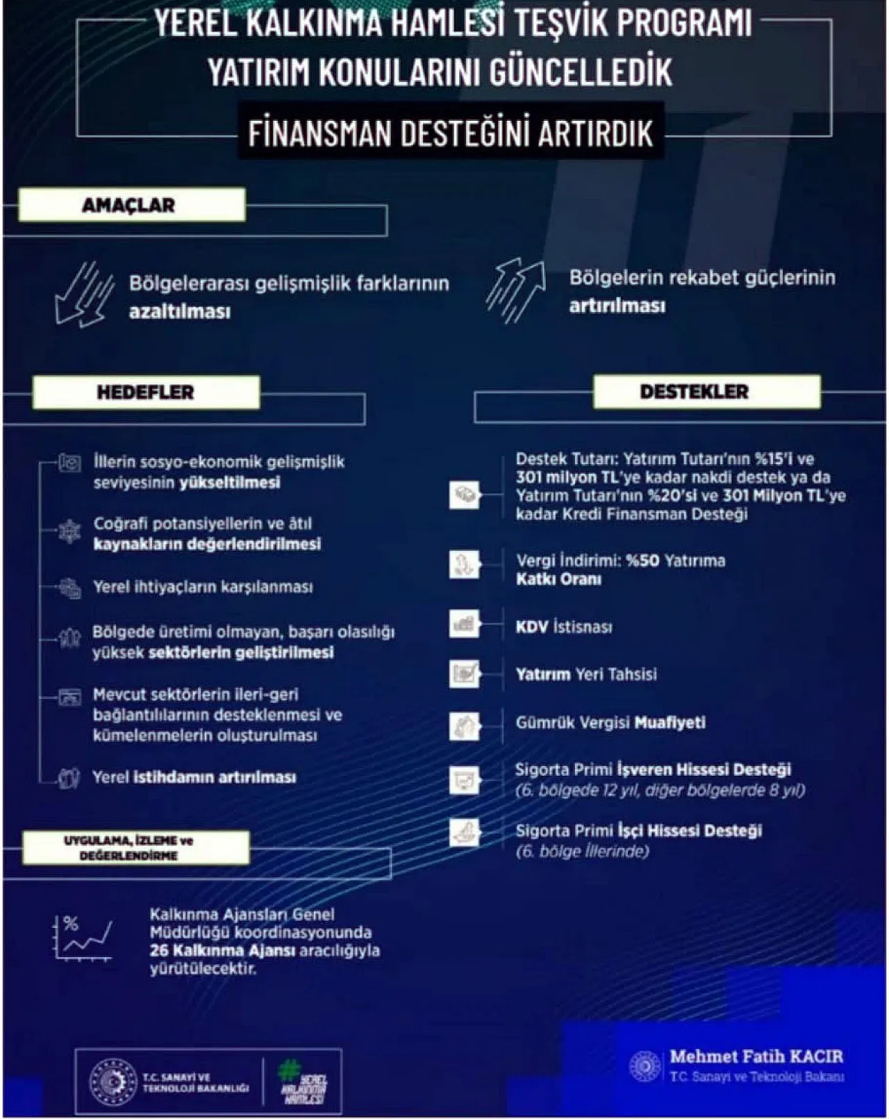 T.C. Sanayi ve Teknoloji Bakanı Mehmet Fatih Kacır Kalkınma Ajansları aracılığıyla 2026 yılında desteklenecek yatırım konularını açıkladı.