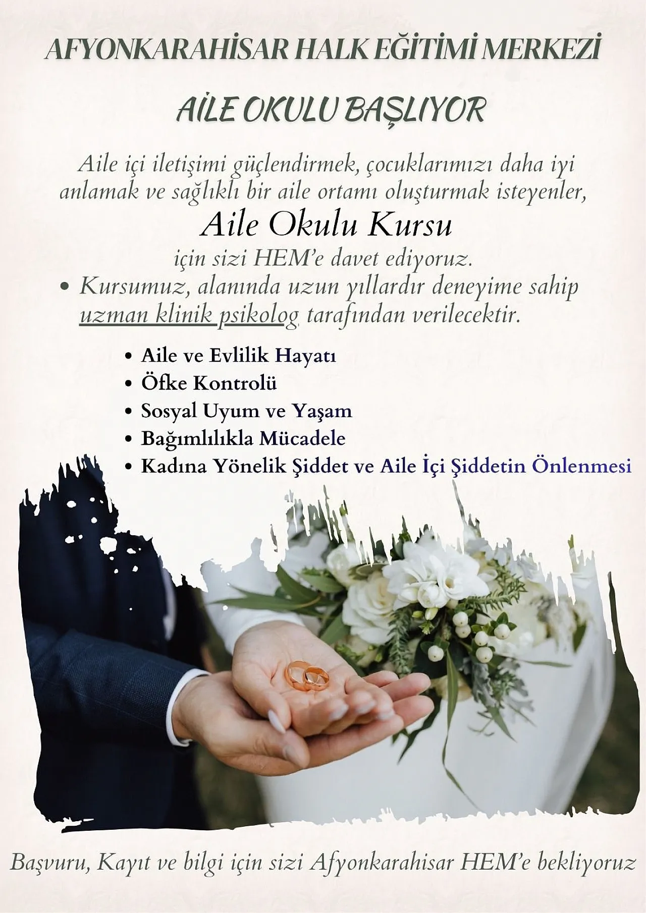 Afyonkarahisar Halk Eğitim Merkezi Müdürlüğü tarafından, aile içi iletişimi güçlendirmek ve bireylerin psikososyal gelişimine katkı sağlamak amacıyla 'Aile Okulu' kursları açılacak.