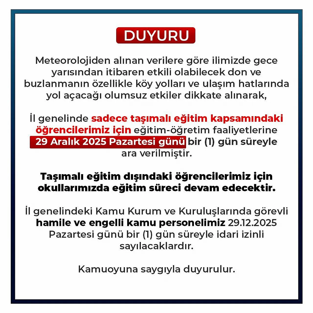 Özellikle köy yolları ve ulaşım hatlarında oluşabilecek olumsuzlukların dikkate alındığı ifade edilen açıklamada, bu kapsamda il genelinde sadece taşımalı eğitim kapsamındaki öğrenciler için eğitim-öğretim faaliyetlerine 29 Aralık 2025 Pazartesi günü bir gün süreyle ara verildiği kaydedildi.