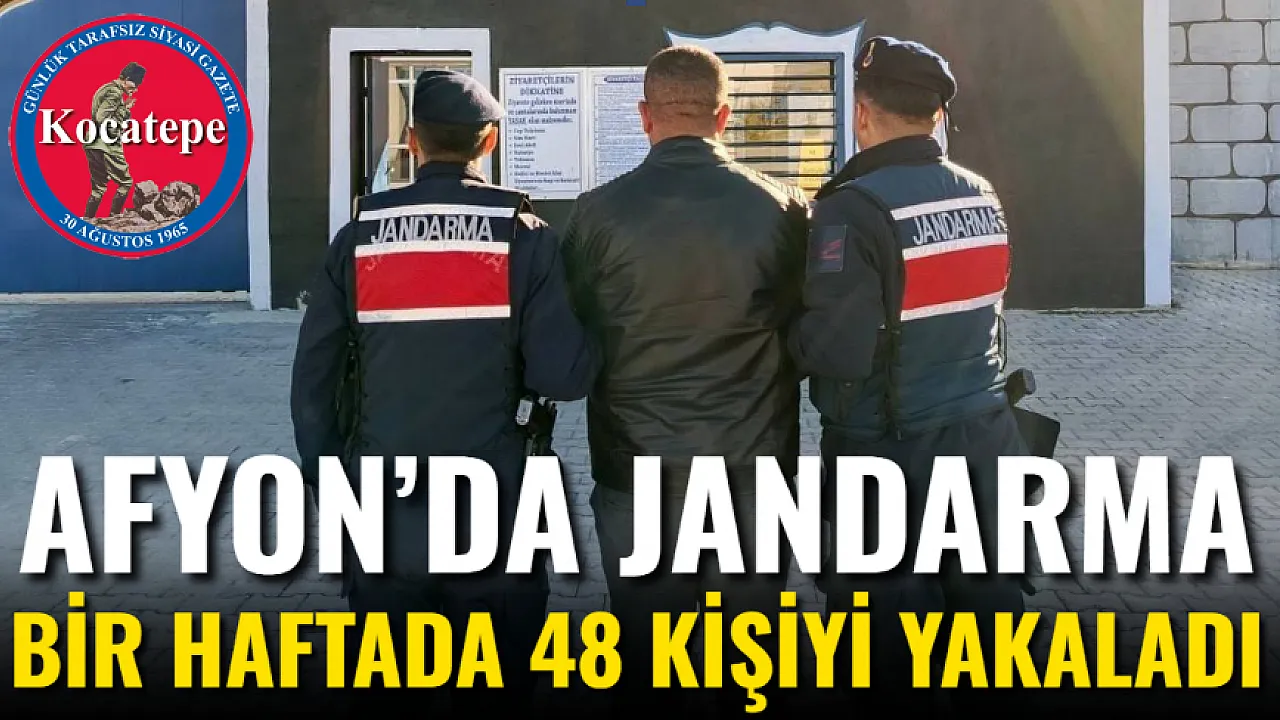 Afyonkarahisar İl Jandarma Komutanlığı ekipleri tarafından, son bir hafta içerisinde 15 Aralık – 21 Aralık 2025 tarihleri arasında, aranan şahısların tespiti ve yakalanmasına yönelik icra edilen yol kontrol ve devriye faaliyetlerinde dolandırıcılık suçundan 4, hırsızlık suçundan 1, kaçakçılık suçundan 4, narkotik suçlardan 7, öldürme suçundan 1, siber suçlardan 6, yağma suçundan 1 ve diğer suçlardan 24 şahıs olmak üzere, toplam 48 şahıs yakalandı.