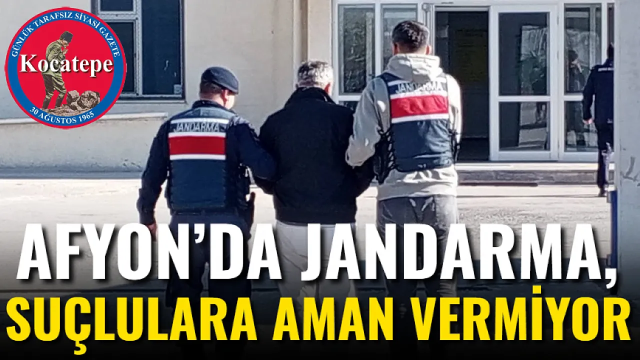 Öte yandan Afyonkarahisar İl Jandarma Komutanlığınca, aranan şahısların tespiti ve yakalanmasına yönelik yapılan titiz çalışmalar neticesinde; Uyuşturucu veya Uyarıcı Madde Ticareti Yapma veya Sağlama, suçundan hakkında 15 yıl 8 ay kesinleşmiş hapis cezası bulunan O.E. isimli şahıs ve Cebir Tehdit veya Hile Kullanarak Kişiyi Hürriyetinden Yoksun Kılma, Müstehcen Yayınların Üretiminde Çocukları Kullanmak, ve 12 Yaşını Tamamlamış Çocuğun Nitelikli Cinsel İstismarı, suçlarından hakkında 9 yıl 2 ay kesinleşmiş hapis cezası bulunan E.U. isimli şahıs yakalandı; şahıslar çıkarıldıkları mahkemelerce tutuklanarak Ceza İnfaz Kurumlarına teslim edildi.