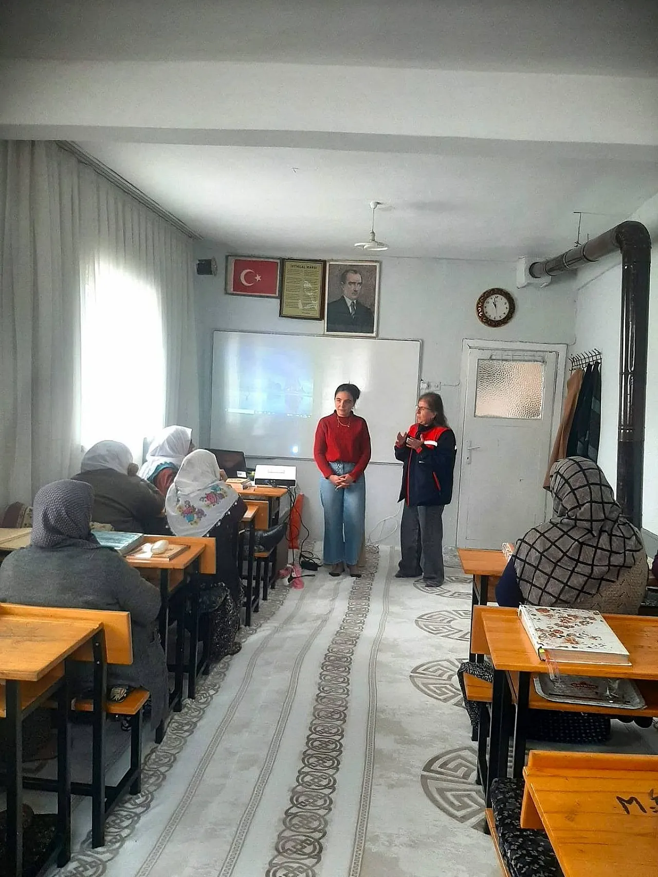 Bu hafta yapılan kadın çiftçi eğitim toplantılarında Kadın ve Demokrasi Vakfı İl Temsilciliği Sekreteri Psikolog Elmas Aybike Yılmaz tarafından kadına yönelik şiddet, kadınların yararlanabileceği sosyal destek mekanizmaları ve kamu hizmetlerine erişim konularında bilgilendirme yapıldı.