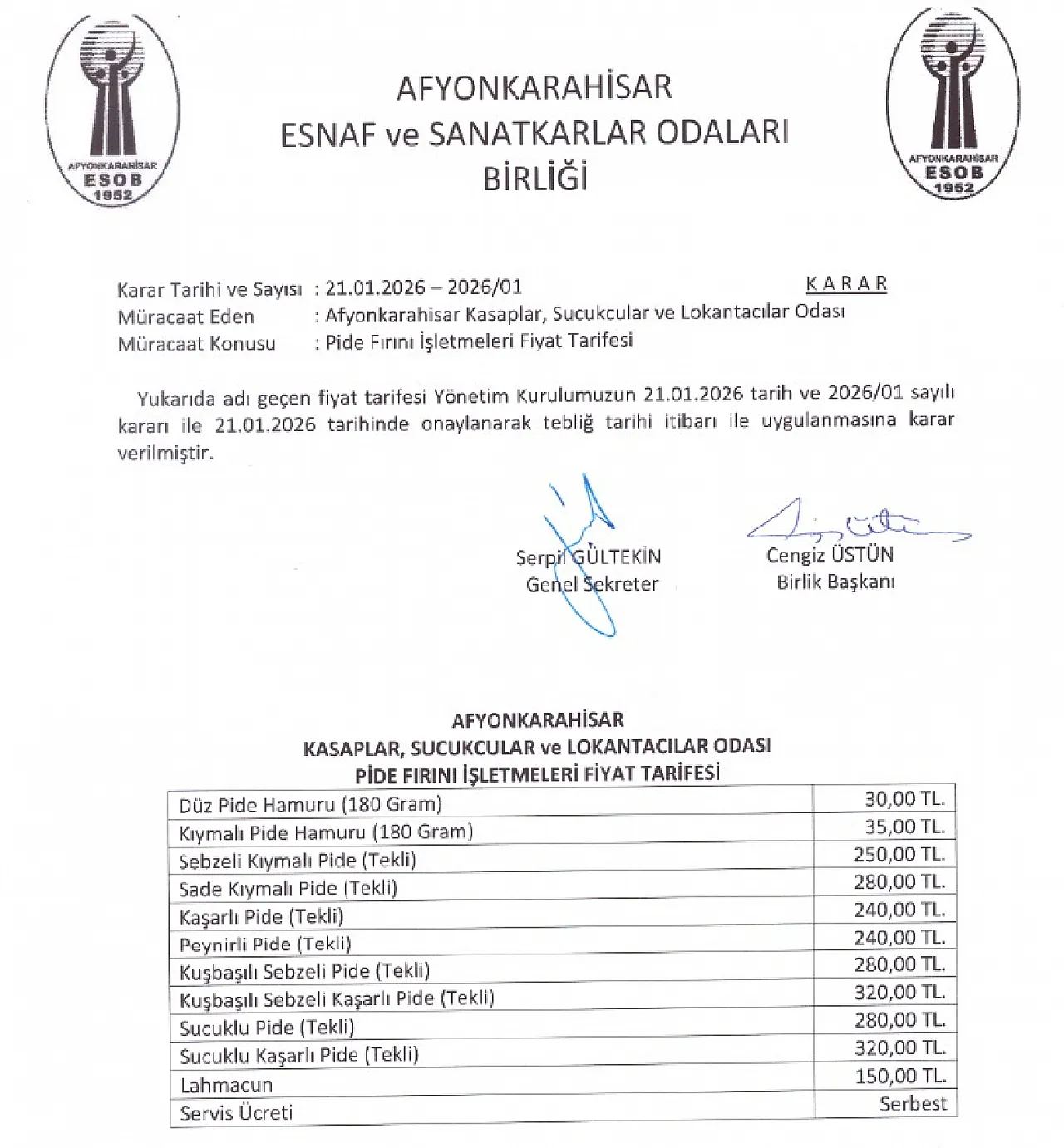 21 Ocak tarihi itibariyle onaylanıp uygulanmaya başlanan yeni fiyat tarifesine göre tekli kaşarlı pide 240 TL, tekli peynirli pide 240 TL, tekli kuşbaşılı, sebzeli pide 280 Tl, tekli kuşbaşılı sebzeli, kaşarlı pide 320 TL, tekli sucuklu pide 280 TL, tekli sucuklu kaşarlı pide 320 TL ve lahmacun da 150 TL olarak belirlendi. İşletmelerin servis ücretleri ise serbest bırakıldı.