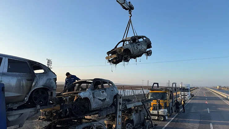 Afyonkarahisar'da BMW marka lüks suv ve binek araçların bulunduğu tırda çıkan yangın sonrası sıfır kilometre otomobiller yanarak hurdaya döndü.