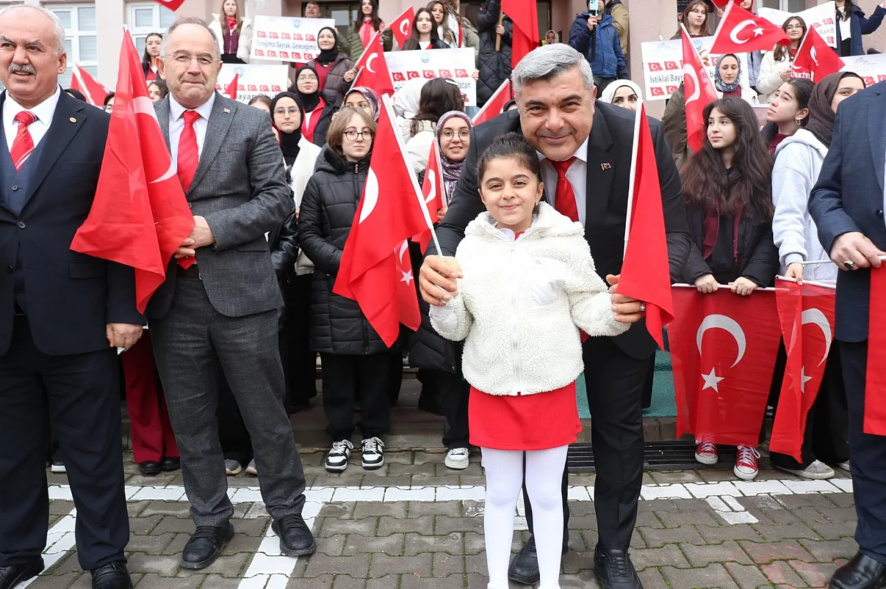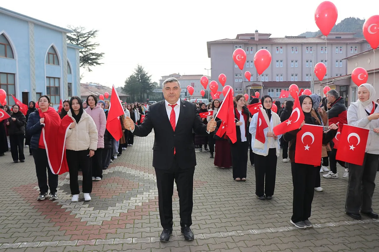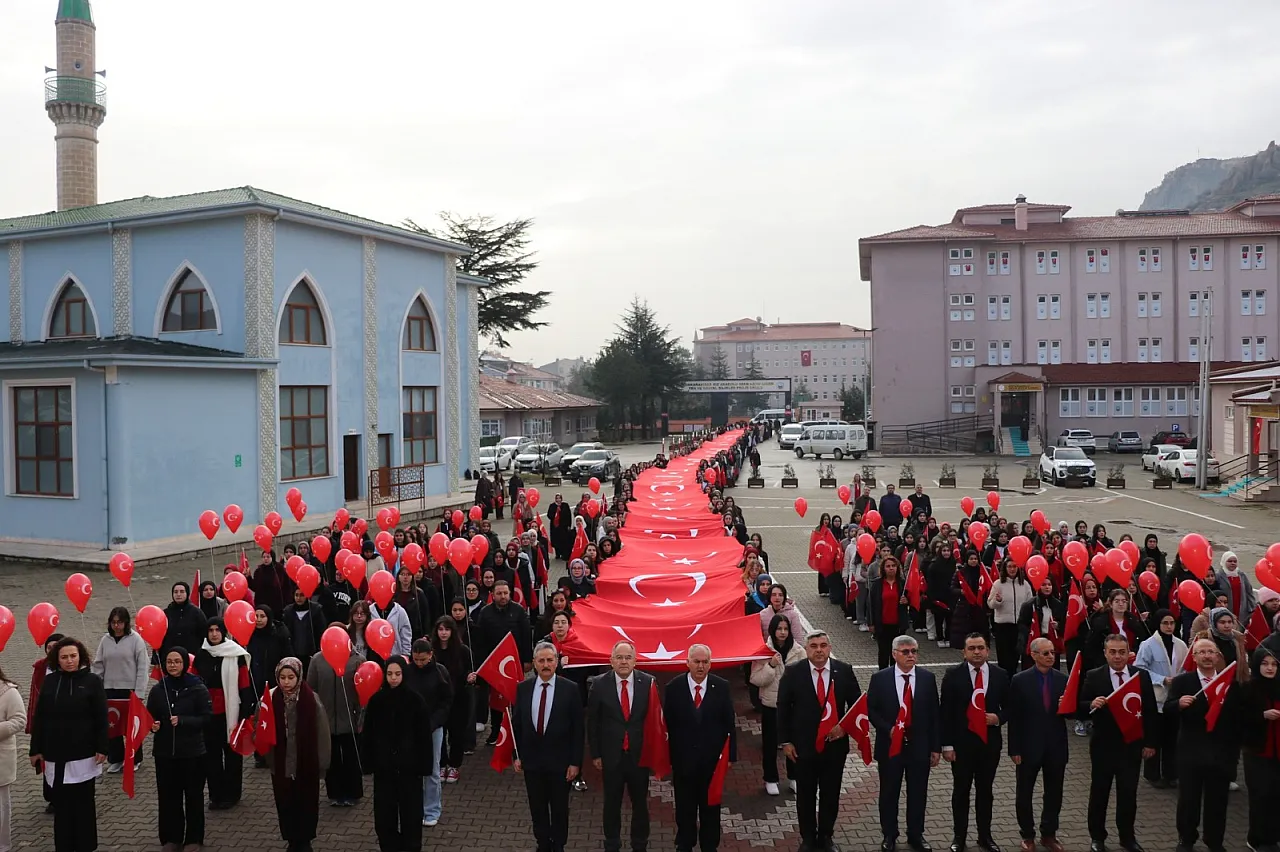 100 metrelik dev bayrağın açılmasıyla başlayan program, öğrencilerin büyük bir coşku ve disiplin içinde gerçekleştirdiği bayrak töreniyle başladı. Milli ve manevi değerlerin yaşatılmasının önemine vurgu yapılan etkinlikte, bayrağımızın bir milletin bağımsızlık sembolü olduğu hatırlatılarak öğrencilerde aidiyet, sorumluluk ve birlik bilincinin güçlendirilmesi hedeflendi. Bir öğrencinin coşkuyla okuduğu “Bayrak Şiiri” gururlu gözlerde duygusal anların yaşanmasına vesile oldu.