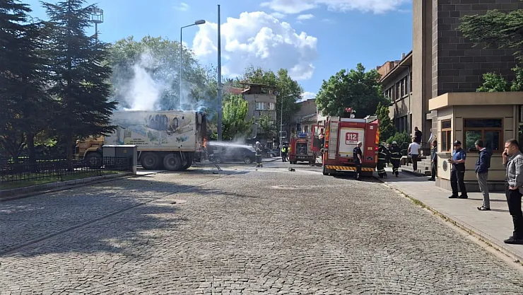 18 Mayıs Pazar günü saat 09.00 sıralarında meydana gelen olayda Valilik ve Hükümet Konağı önünde park halinde bulunan Afyonkarahisar Belediyesi’ne ait kamyonun kasasında yangın çıktı.