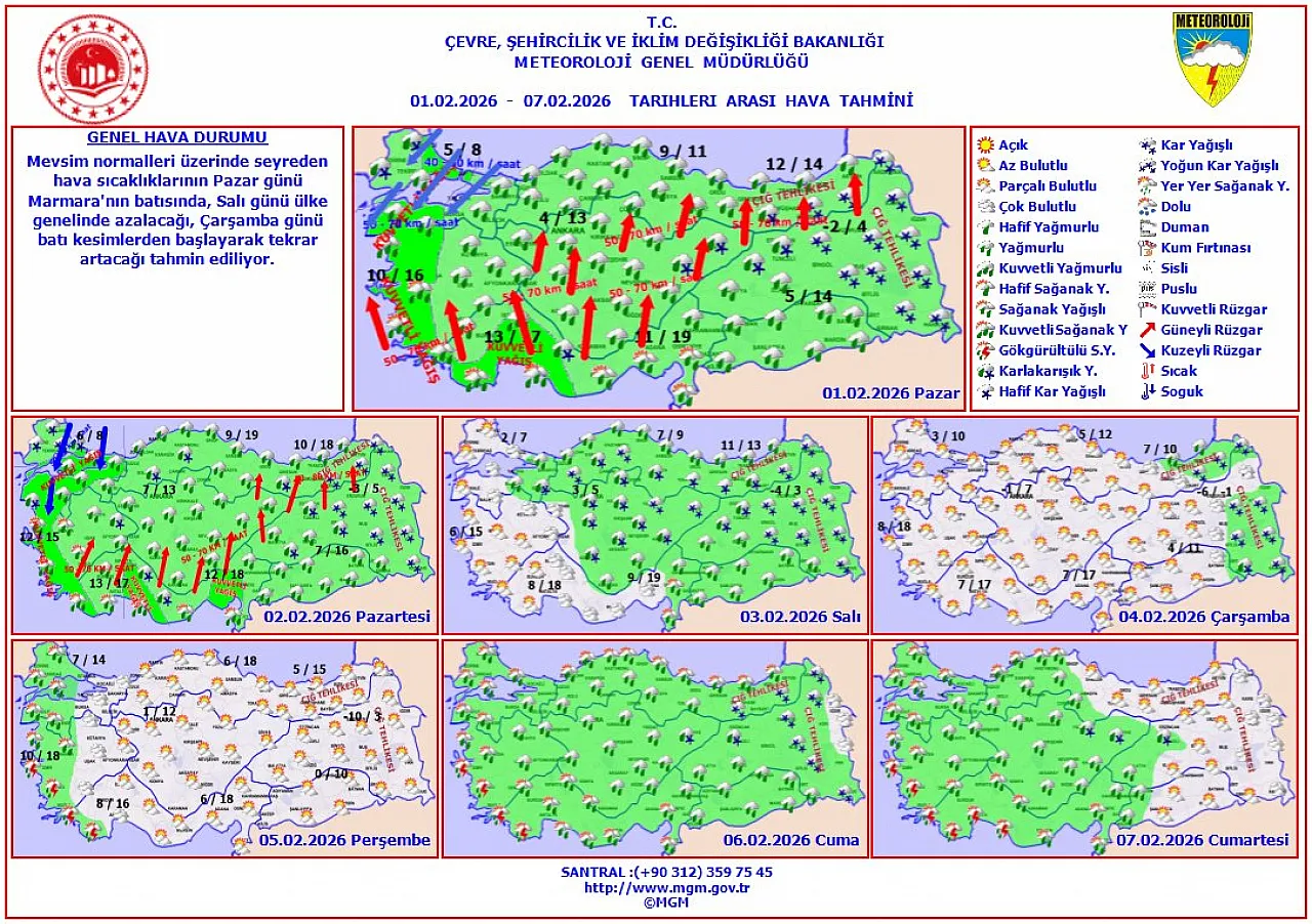 Meteoroloji 5. Bölge Müdürlüğü verilerine göre, mevsim normallerinde seyreden hava sıcaklıklarının, pazar günü Marmara'nın batısında, salı günü ülke genelinde azalacağı; çarşamba günü batı kesimlerden başlayarak tekrar artacağı tahmin ediliyor.