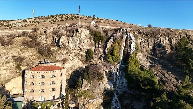 Afyonkarahisar'ın Dinar ilçesinde kısmı bir şekilde donan Suçıkan Şelalesi buz sarkıtları eşliğinde akan suları ile görsel şölen oluşturdu.