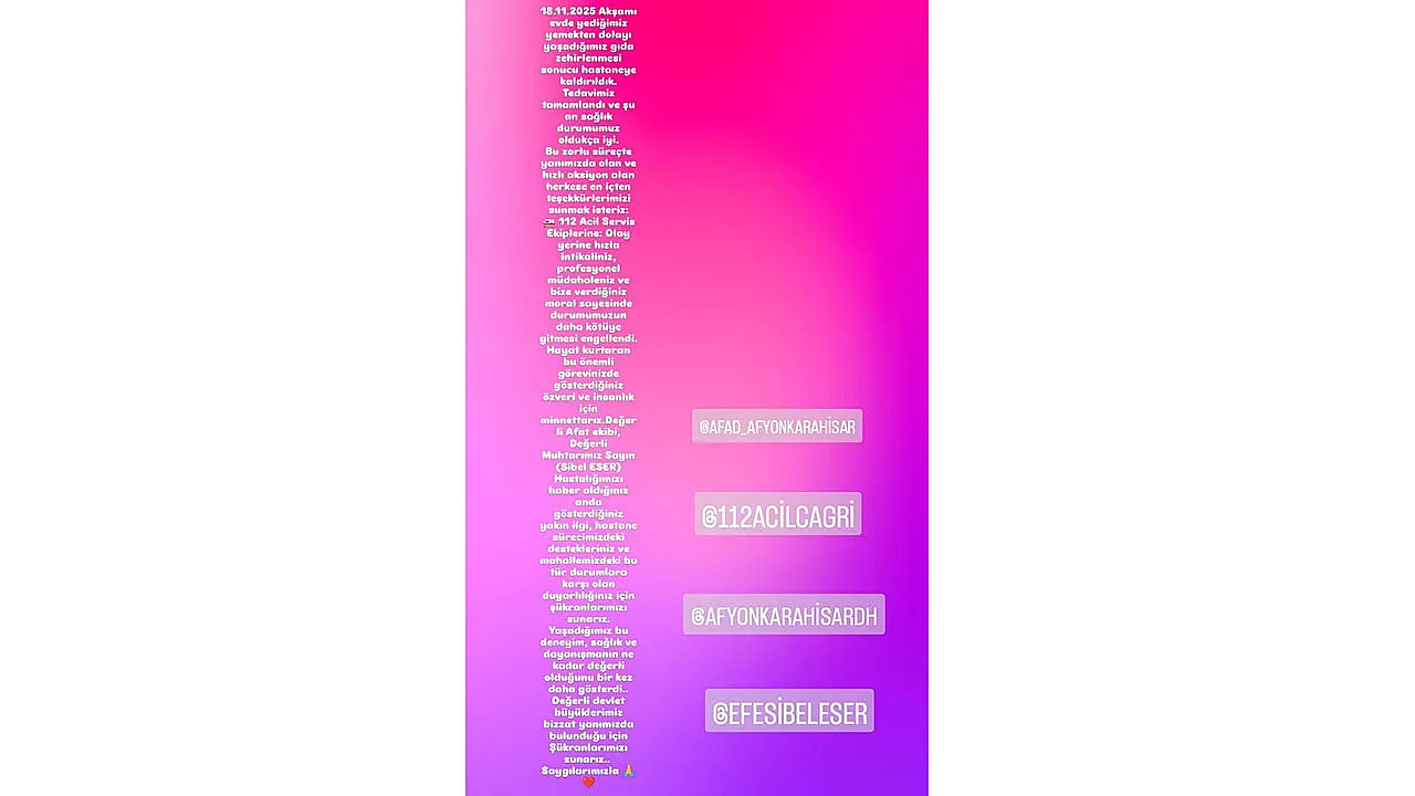 Aile, 18 Kasım 2025 akşamı evde tükettikleri yemekten sonra fenalaşarak hastaneye kaldırıldıklarını, uygulanan tedavinin ardından sağlık durumlarının iyi olduğunu belirtti. Paylaşımda, süreçte kendilerine destek veren kurumlara teşekkür edildi.