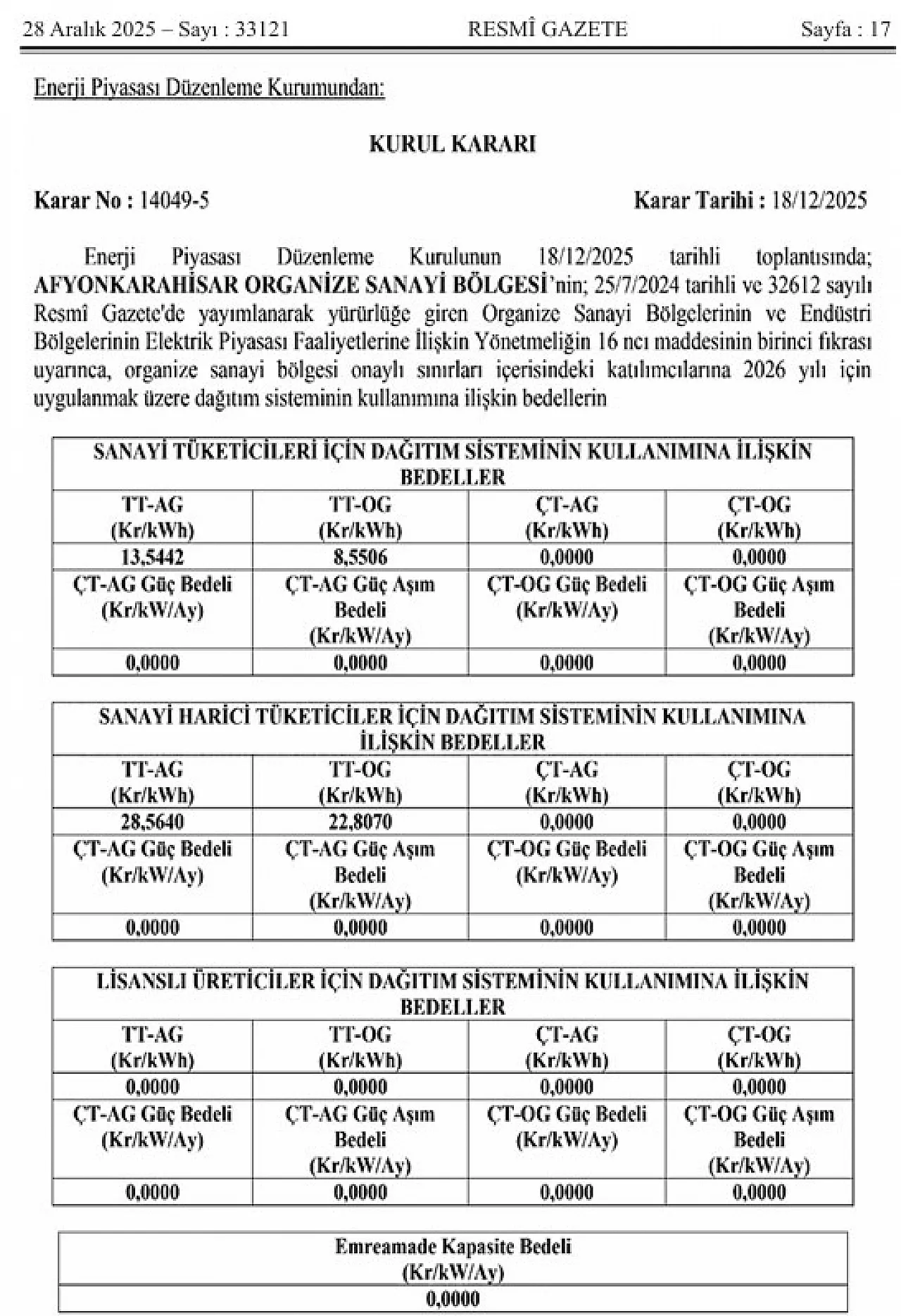 Resmi Gazete'de yayımlanan 14049-5 sayılı Kurul Kararı'na göre, Afyonkarahisar OSB’deki katılımcılar için geçerli olacak yeni tarifeler duyuruldu. İlgili yönetmelik çerçevesinde alınan kararla, sanayi ve sanayi harici tüketiciler için uygulanacak birim bedeller netleşti.