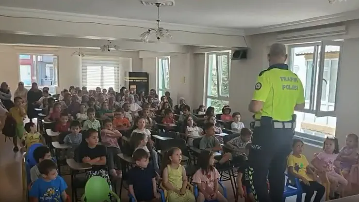 Trafik polisleri tarafından verilen eğitimde, yaya geçidinden bisiklet güvenliğine, emniyet kemerinden trafik ışıklarının anlamına kadar birçok konuda hem çocukların eğlenerek öğrenmeleri sağlandı.