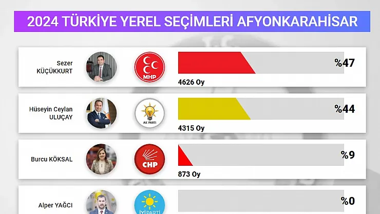 Ankete katılan Afyonkarahisarlıların verdiği oylara göre, “Yarın seçim olsa kim kazanır?” sorusunun cevabı, “MHP Belediye Başkan Adayı Sezer Küçükkurt” olarak açıkça ortaya çıktı.