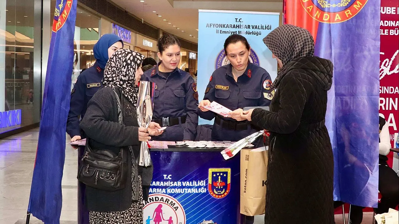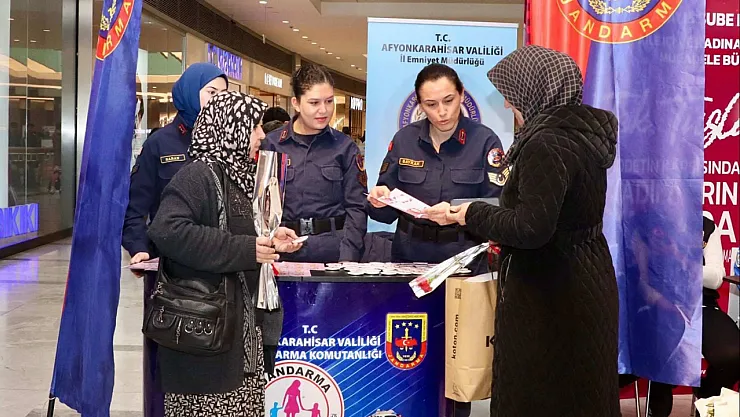 Afyonkarahisar İl Jandarma Komutanlığı’nın Park Afyon AVM’ de 8 Mart Dünya Kadınlar Gününe özel kurulan standın da Kadınlar Günü kutlanırken KADES uygulaması hakkında bilgi verildi.