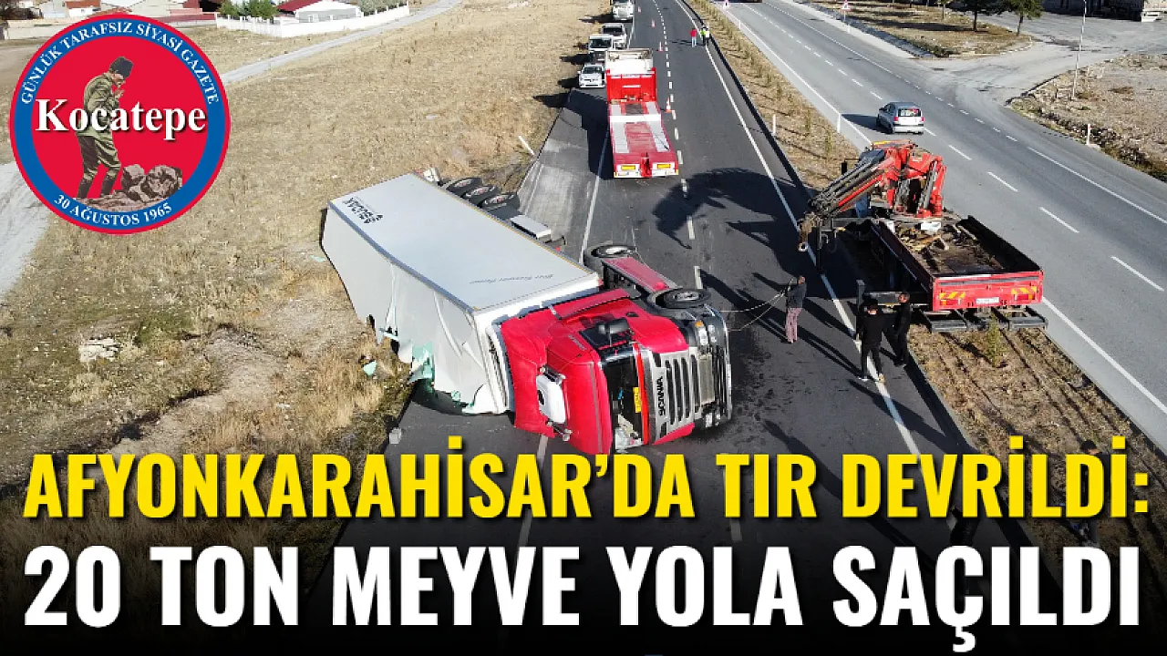 Afyonkarahisar'da kontrolden çıkan tırın devrilmesi sonucu meydana gelen trafik kazasında yaklaşık 20 ton meyve çevreye saçılarak ziyan oldu.