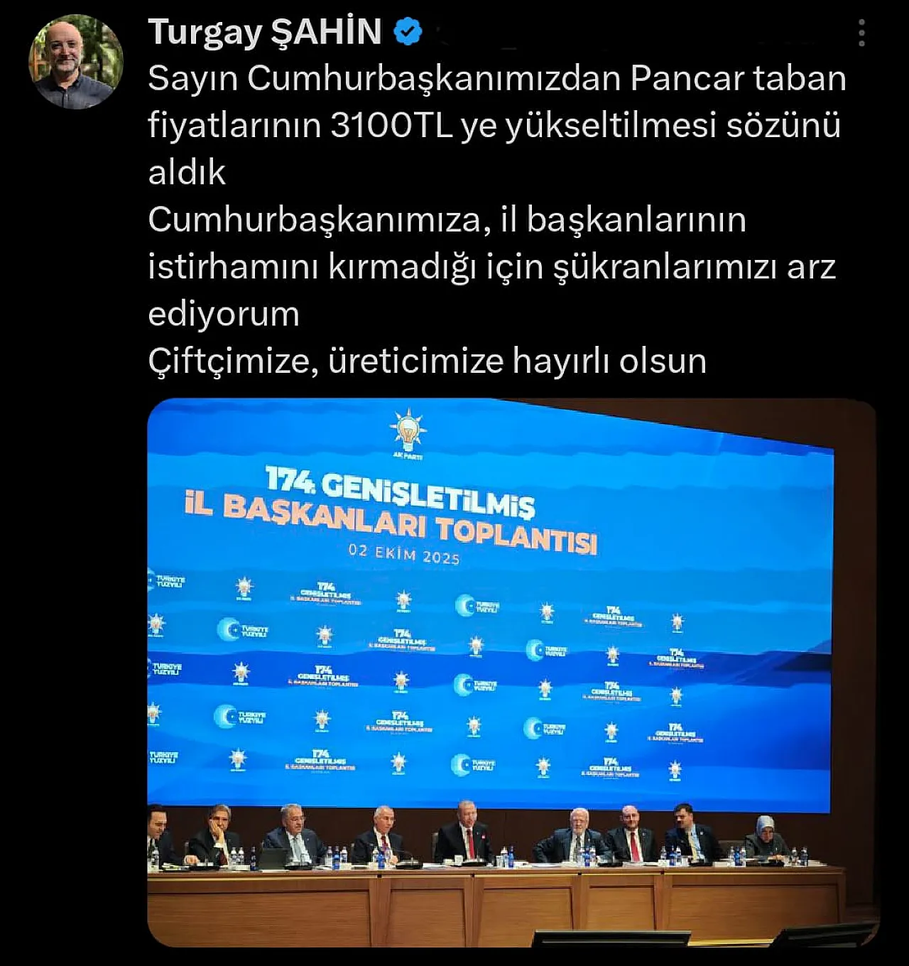 Başkan Şahin paylaşımında "Sayın Cumhurbaşkanımızdan Pancar taban fiyatlarının 3100 TL’ye yükseltilmesi sözünü aldık. Cumhurbaşkanımıza, il başkanlarının istirhamını kırmadığı için şükranlarımızı arz ediyorum. Çiftçimize, üreticimize hayırlı olsun." ifadelerine yer verdi.