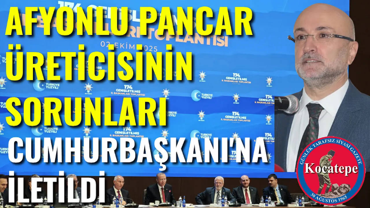 AK Parti Afyonkarahisar İl Başkanı Av. Turgay Şahin, Ankara'da gerçekleştirilen 174. Genişletilmiş İl Başkanları Toplantısında, Afyonkarahisar'ın talep ve isteklerini doğrudan Cumhurbaşkanı ve AK Parti Genel Başkanı Recep Tayyip Erdoğan'a iletti. Bu talepler arasında, bölge için büyük önem taşıyan pancar üreticilerinin sorunları da yer aldı.