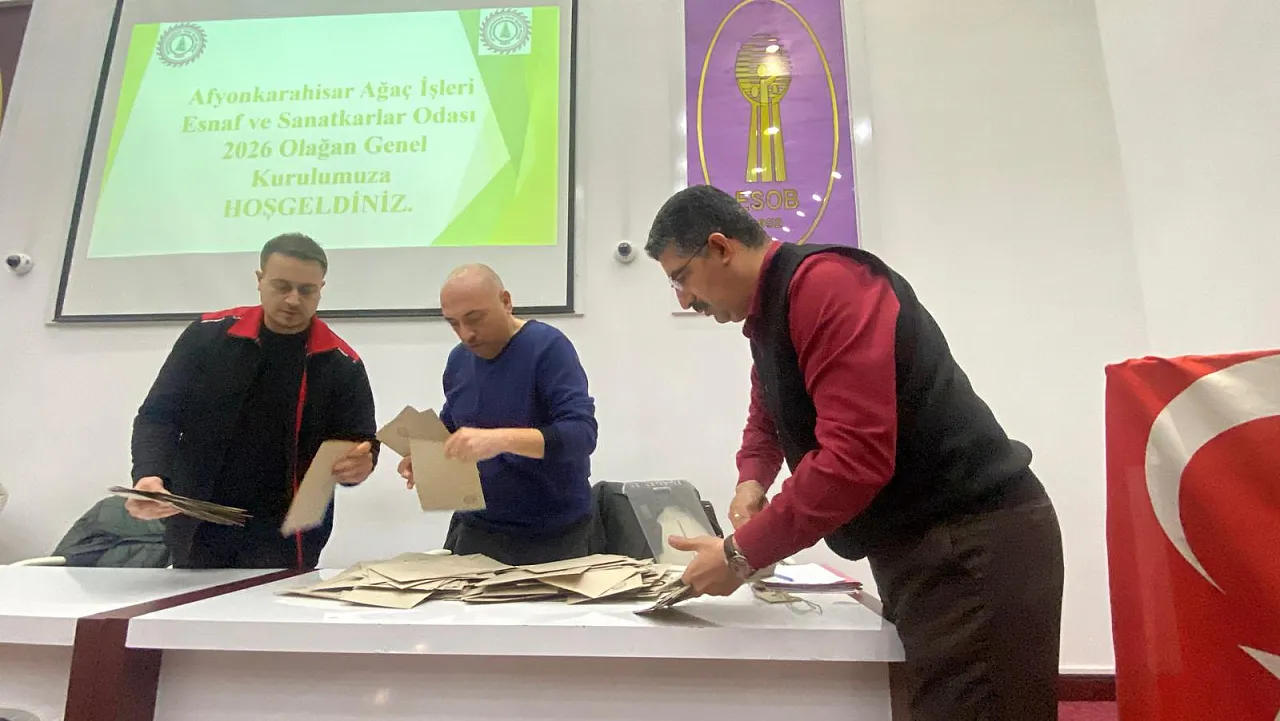 Afyonkarahisar Ağaç İşleri Esnaf ve Sanatkârlar Odası’nın 2026 yılı olağan genel kurul toplantısının ardından yapılan seçimde başkan adayları Osman Yıldırım kırmızı renkli, Mehmet Özdemir, ise krem renkli liste ile seçime katıldı.