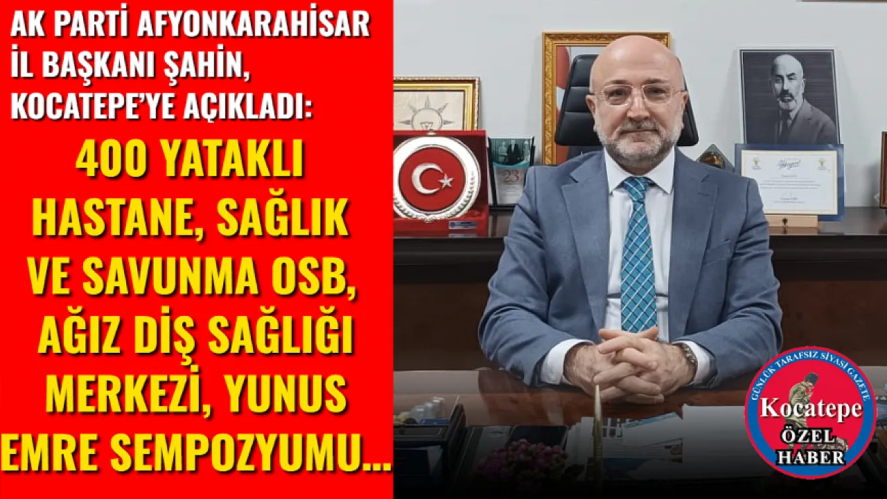 - Ak Parti Afyonkarahisar İl Başkanı Şahin, Kocatepe'ye Açıkladı: 400 Yataklı Hastane, Sağlık ve Savunma OSB, Ağız Diş Sağlığı Merkezi, Yunus Emre Sempozyumu…
