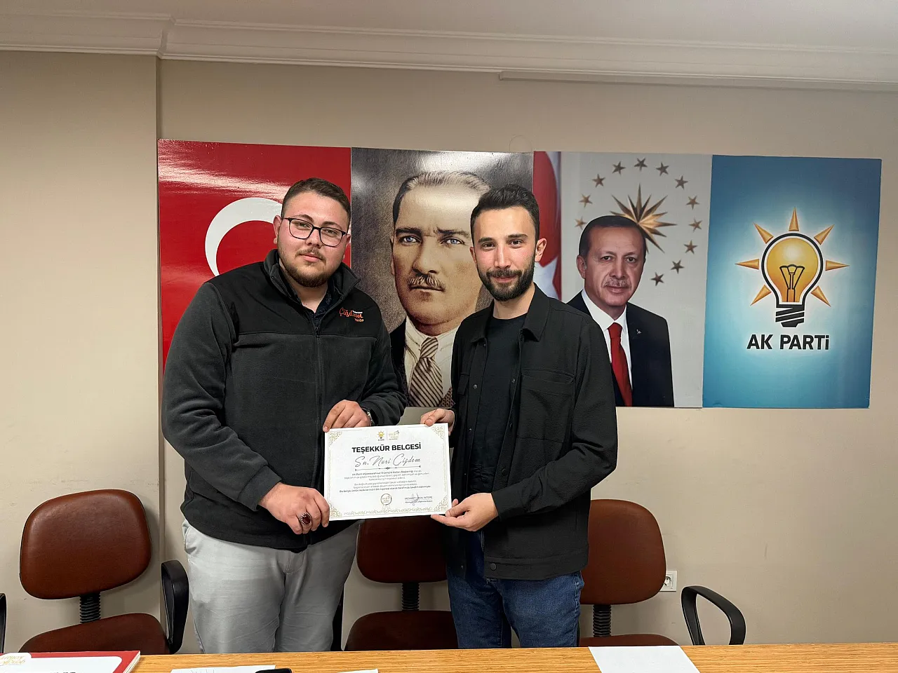 İl Gençlik Kolları Başkanı Mehmet Emin İntepe, sahada özveriyle çalışan ve etkinliklerin organizasyonunda görev üstlenen Yeni Seçmen Birimi Başkanları Fadime Aksoy ve Nuri Çiğdem’e teşekkür belgesi takdim etti. Gençliğin sahadaki varlığının önemine dikkat çeken İntepe, teşkilatın dinamik yapısına güç katan tüm gençlere minnettar olduğunu ifade etti.