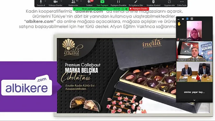Eğitimde kadın kooperatiflerine sunum yapan Afyon Eğitim Vakfı Genel Sekreteri Murat Diker, albikere.com e-ticaret sitesinin kuruluş amacını ve kadın kooperatiflerine sağladığı avantajları anlattı ve henüz mağaza açmamış kooperatifleri mağaza açmaya davet etti. Diker, albikere.com’un Afyonkarahisar Valisi Gökmen Çiçek’in önerisi ile Afyon Eğitim Vakfı İktisadi İşletmesi tarafından kurulduğunu, sitenin Afyonkarahisar Valiliği ile Afyonkarahisar Ticaret ve Sanayi Odası tarafından desteklendiğini sözlerine ekledi.