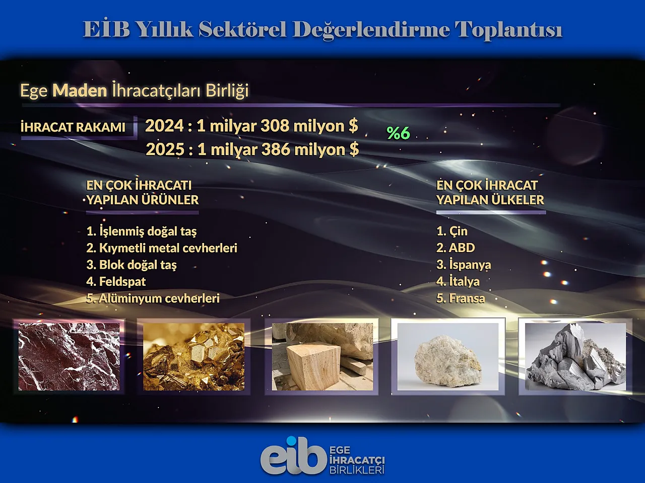 "Ege Maden İhracatçıları Birliği olarak da en yüksek ihracatı kalemimiz doğal taş olurken onu kıymetli metal cevherleri ve feldspat takip etti.