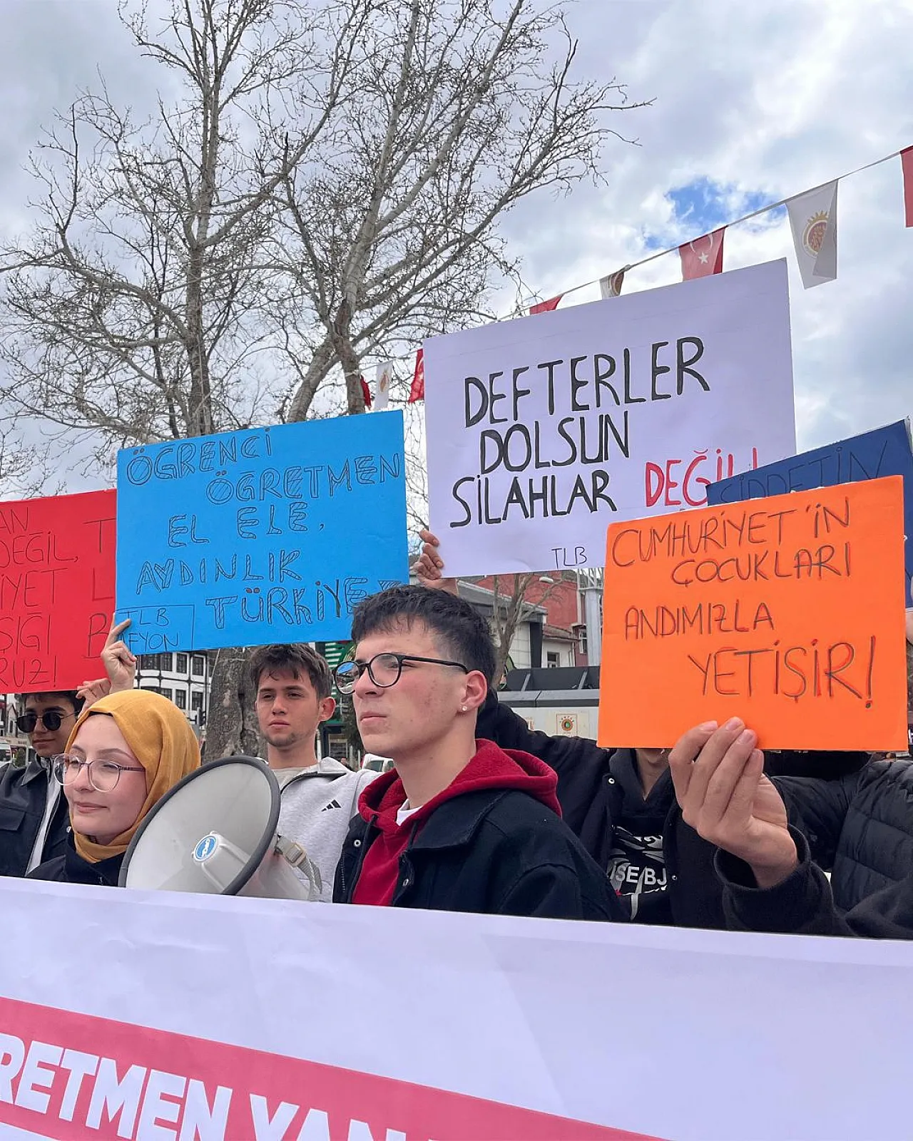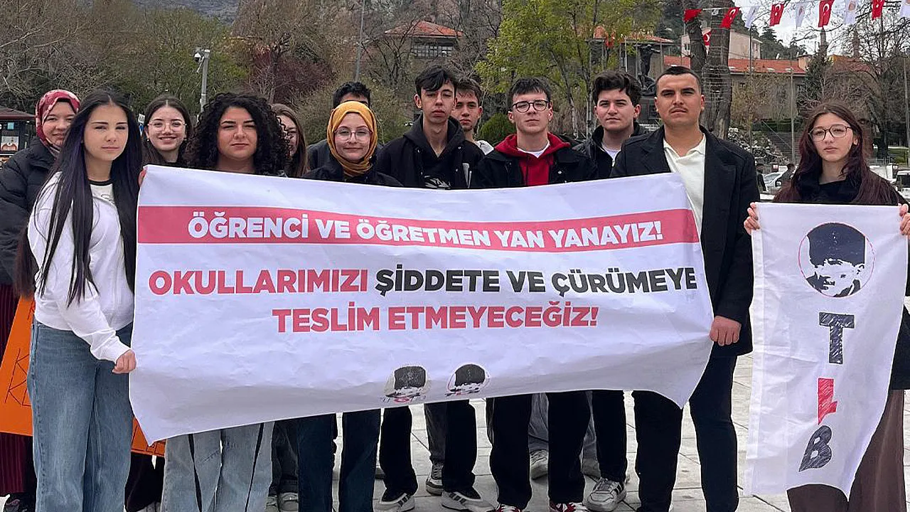 Türkiye Liseliler Birliği (TLB) üyesi öğrencileri Zafer Meydanı’nda, Kahramanmaraş ve Şanlıurfa’da okullara yönelik saldırılarda vefat eden öğrenciler ve öğretmen Ayla Kara’yı anmak, “Öğrenci Öğretmen El Ele” sloganıyla okulları şiddete teslim etmeyeceklerini vurgulayan bir açıklama yapıldı.