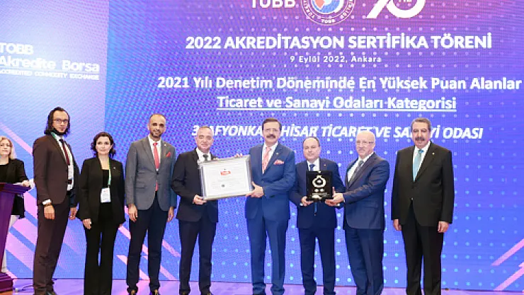 Akreditasyon sistemi denetiminden geçen Oda ve Borsalar, sertifikalarını Türkiye Odalar ve Borsalar Birliği Konferans Salonu’nda gerçekleştirilen törenle, TOBB Başkanı M. RifatHisarcıklıoğlu’nun elinden aldılar. Hisarcıklıoğlu’nun ev sahipliğindeki törene; Ticaret Bakan Yardımcısı Sezai Uçarmak katıldı. Törene Afyonkarahisar Ticaret ve Sanayi Odası Meclis Başkanı Dr. Mehmet Sıtkı Merdivenci, Afyonkarahisar Ticaret ve Sanayi Odası Yönetim Kurulu Başkanı Hüsnü Serteser, ATSO Genel Sekreteri Ali Şenol, ATSO Kalite Yönetim ve Akreditasyon Sorumlusu Okan Uyanık, Halkla İlişkiler Personeli Oya Gümüşhan da iştirak etti.