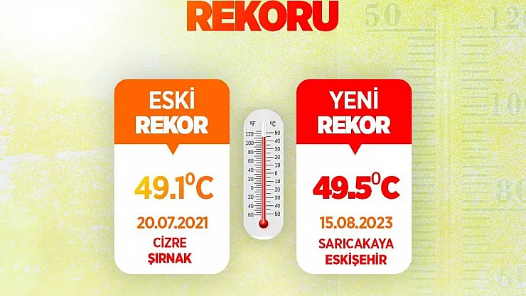 Türkiye bunaltıcı sıcakların etkisi altında kalmaya devam ederken, Eskişehir’de sıcaklık rekoru kırıldı. Çevre, Şehircilik ve İklim Değişikliği Bakanlığı Meteoroloji Genel Müdürlüğü verilerine göre, en yüksek sıcaklık 49,5 derece ile Eskişehir’in Sarıcakaya ilçesinde ölçüldü. Konuyla ilgili sosyal medya hesabından bir paylaşım yapan Bakan Özhaseki, “Ülkemizi etkisi altına alan sıcak hava dalgasının etkisiyle, bugün Türkiye’de sıcaklık rekoru kırıldı. Çevre, Şehircilik ve İklim Değişikliği Bakanlığı Meteoroloji Genel Müdürlüğümüz verilerine göre; en yüksek sıcaklık 49,5 C ile Eskişehir Sarıcakaya’da ölçüldü. Eski rekor 20 Temmuz 2021’de 49,1 C ile Şırnak Cizre’de ölçülmüştü. Bu anlamda iklim değişikliğiyle mücadele için; Cumhurbaşkanımız Sayın Recep Tayyip Erdoğan’ın ortaya koydukları 2053 Net Sıfır Emisyon ve Yeşil Kalkınma hedeflerimiz doğrultusunda herkesi duyarlı olmaya davet ediyorum.” ifadelerine yer verdi.