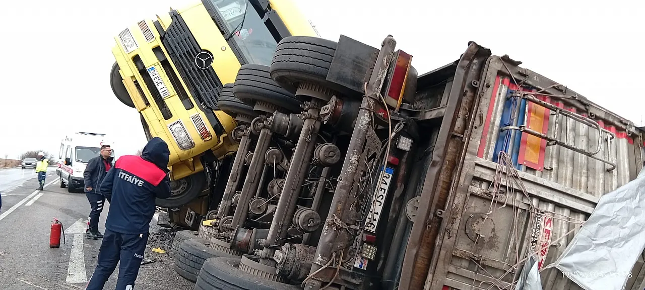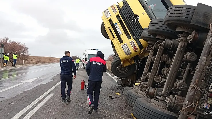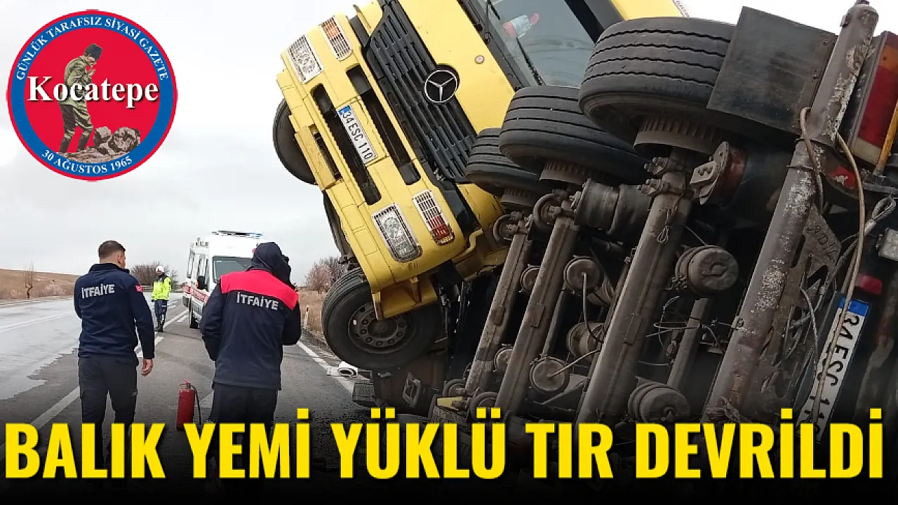 Afyonkarahisar'da yağışlı hava nedeniyle kontrolden çıkarak devrilen balık yemi yüklü tırın sürücüsü yaralandı.