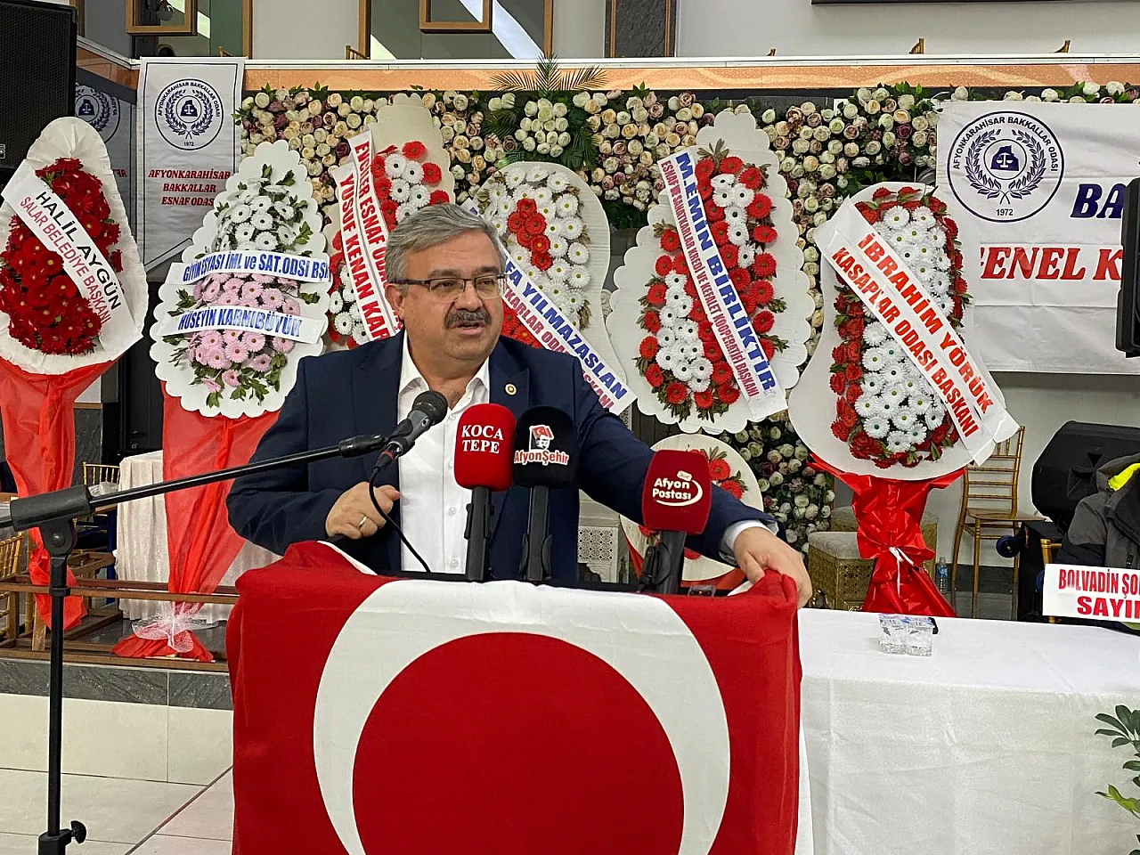 Afyonkarahisar Bakkallar Esnaf Odası'nın 2026 olağan genel kurul toplantısında; Siyasetçiler, federasyon başkanları ve oda başkanları bir araya gelerek esnafın karşılaştıkları sorunları ve çözüm önerilerini söz alarak dile getirdiler.