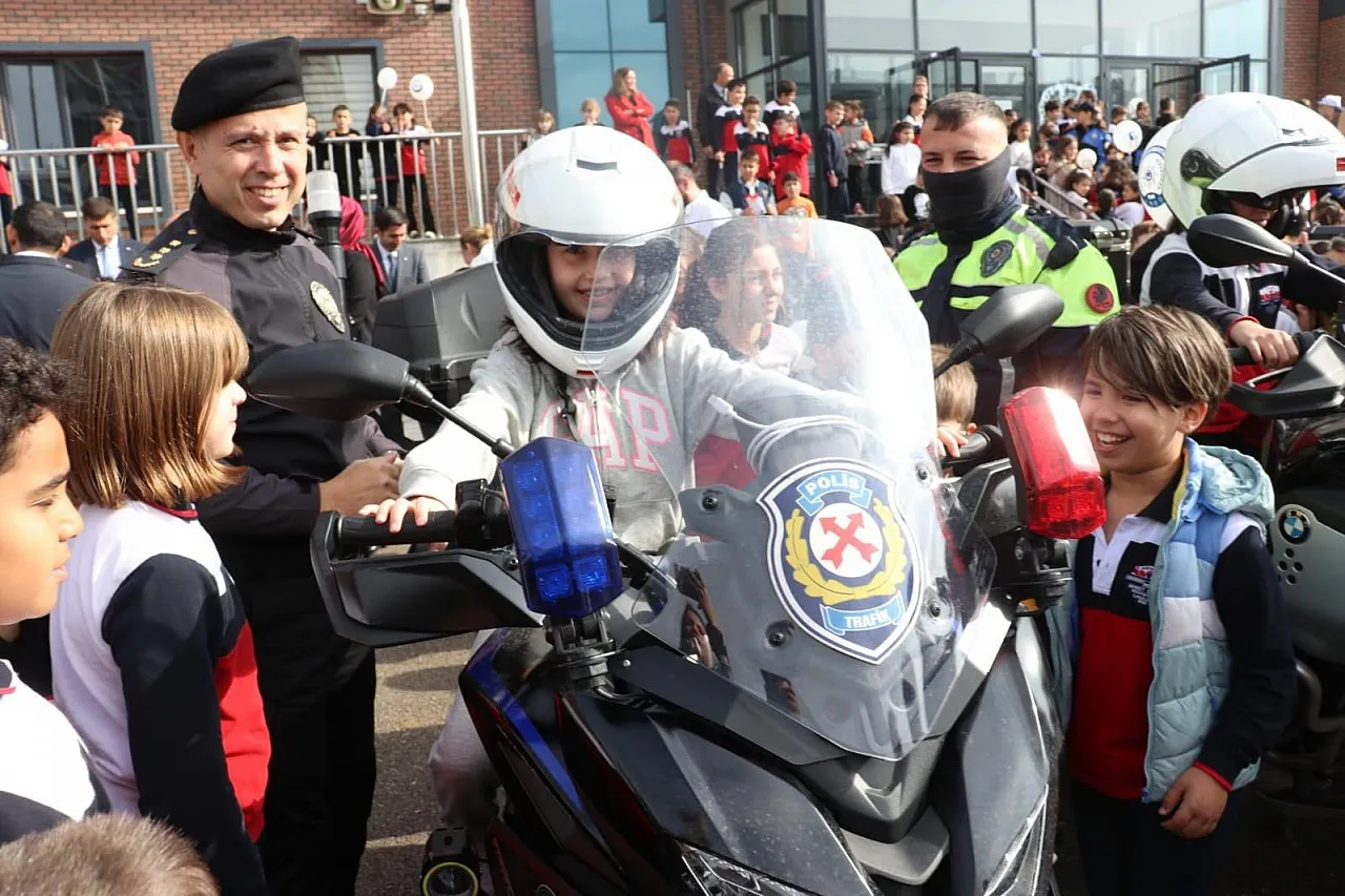 Minik öğrencilere güvenli yaşam bilinci, trafik kuralları ve emniyetin hayatımızdaki önemi üzerine farkındalığın oluşturulduğu etkinlikte polis şapkası ve düdük hediye edildi.
