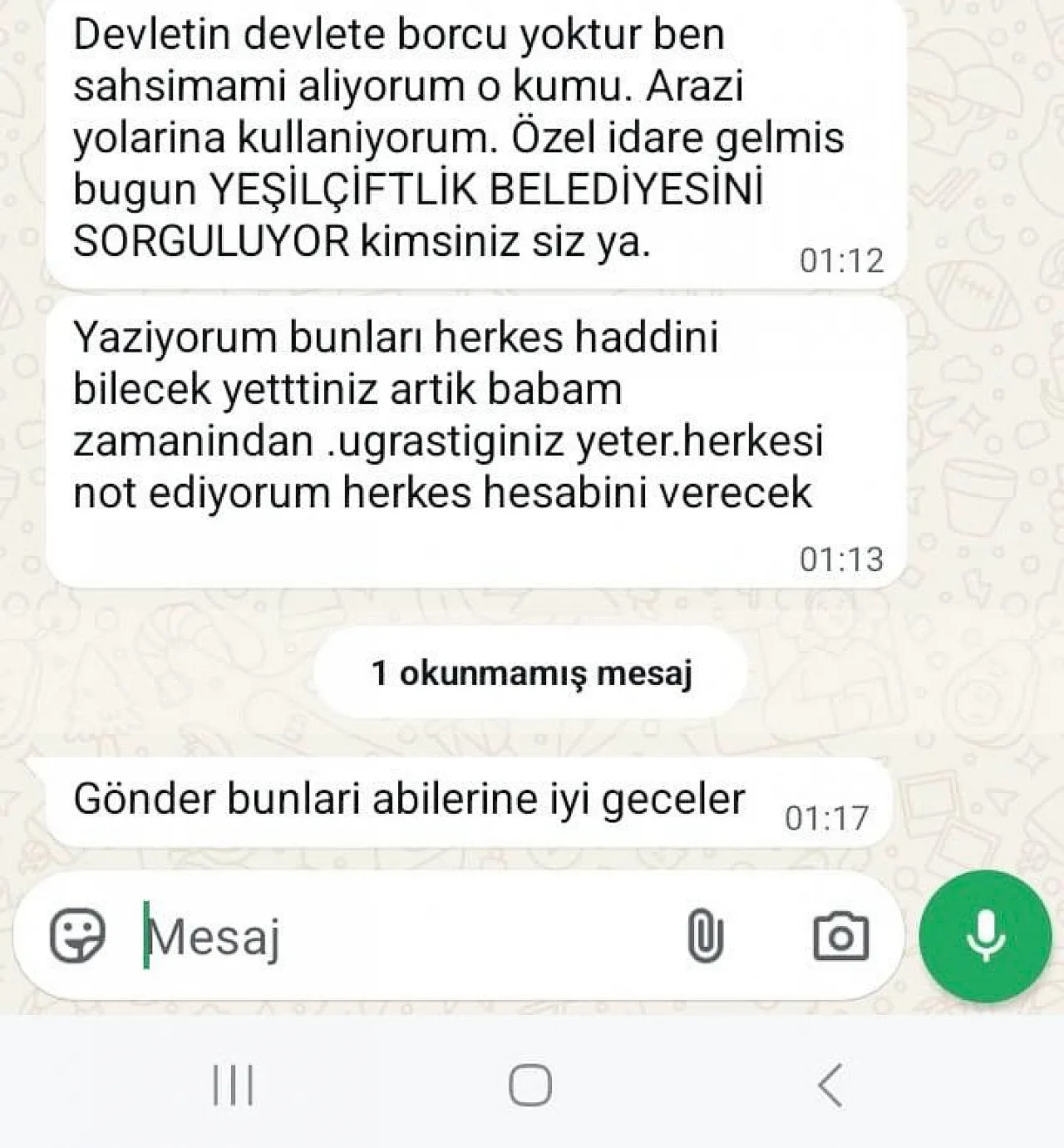 "İyi akşamlar sayın köylülerim. Yeşilçiftlik Belediyesi mahkemelik olan kum ocağından kum çektiği için gerekli yerlere bildirilmiş ve gereken yapılarak kum alımı durdurulmuştur. Yeşilçiftlik Belediye Başkanının bana yazmış olduğu mesajı sizlerle paylaşmak istedim; bundan sonra Yeşilçiftlik Belediyesi'nden talepte bulunurken bu mesajları dikkate alarak talepte bulunun."