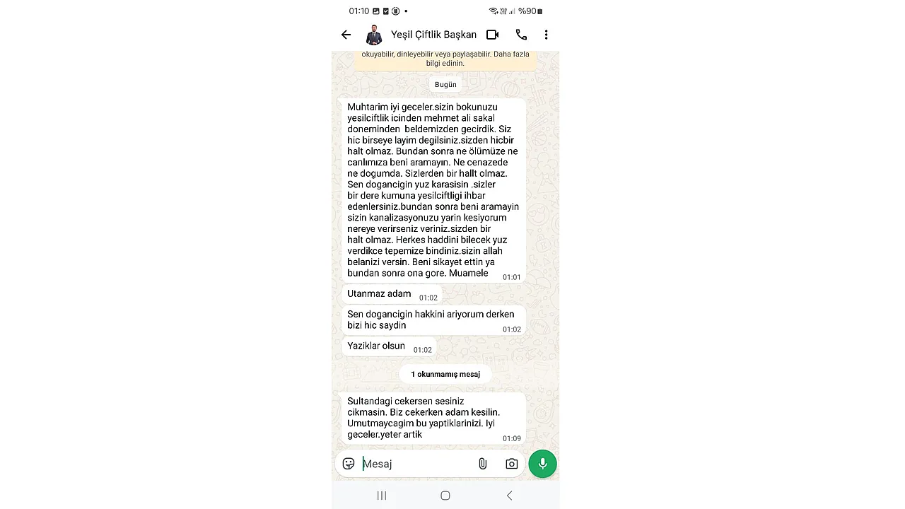 Muhtarım, iyi geceler. Sizin b.kunuzu Yeşilçiftlik içinden, Mehmet Ali Sakal döneminden beldemizden geçirdik. Siz hiçbir şeye layık değilsiniz. Sizden hiçbir halt olmaz. Bundan sonra ne ölümüze ne dirimize beni aramayın. Ne cenazede ne doğumda… Sizlerden bir şey olmaz.