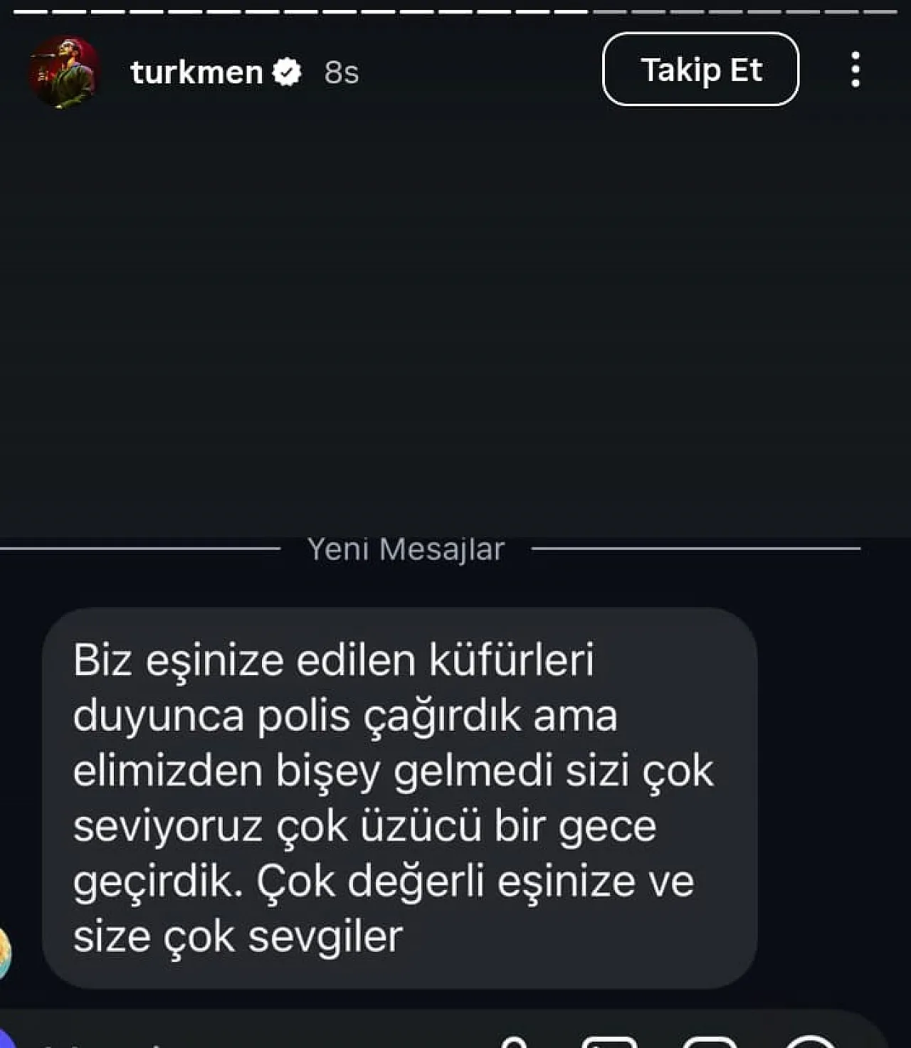 Yaşanan olayların ardından sosyal medya hesabından açıklama yapan Türkmen, "Bugün birbirinden değerli sevenlerimizi böyle saçma ve kötü işletilen bir yerde (üstelik yeni olmasına rağmen) ağırladığım için çok üzgünüm. Hakkınızı helal edin.