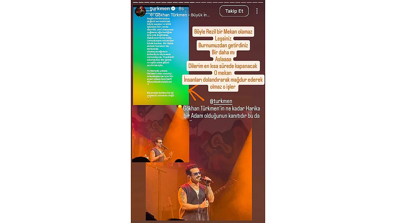 Afyonkarahisar'da bir eğlence merkezinde ünlü sanatçı Gökhan Türkmen'in konseri sonrası ortalık karıştı. Türkmen, sosyal medya hesabından yaptığı açıklamada, 'Bugün birbirinden değerli sevenlerimizi böyle saçma ve kötü işletilen bir yerde ağırladığım için çok üzgünüm. Hakkınızı helal edin' dedi.