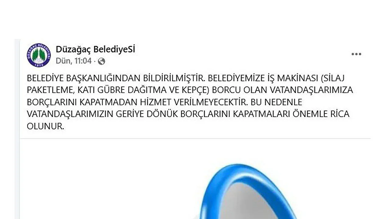 "Belediye başkanlığından bildirilmiştir. Belediyemize iş makinası (silaj paketleme, katı gübre dağıtma ve kepçe) borcu olan vatandaşlarımıza borçlarını kapatmadan hizmet verilmeyecektir. Bu nedenle vatandaşlarımızın geriye dönük borçlarını kapatmaları önemle rica olunur."
