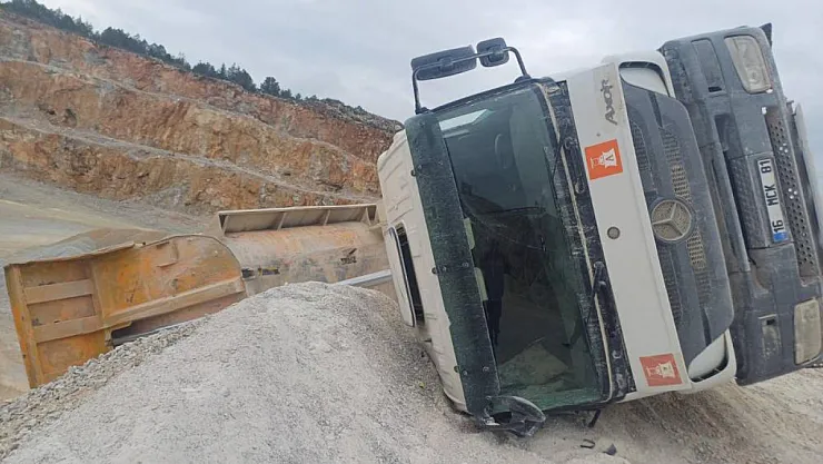 Bilecik'in Necmiye Köyü bölgesinde bulunan inşaat şantiyesinde geri manevra yapan kum yüklü kamyon yan yatarak devrildi