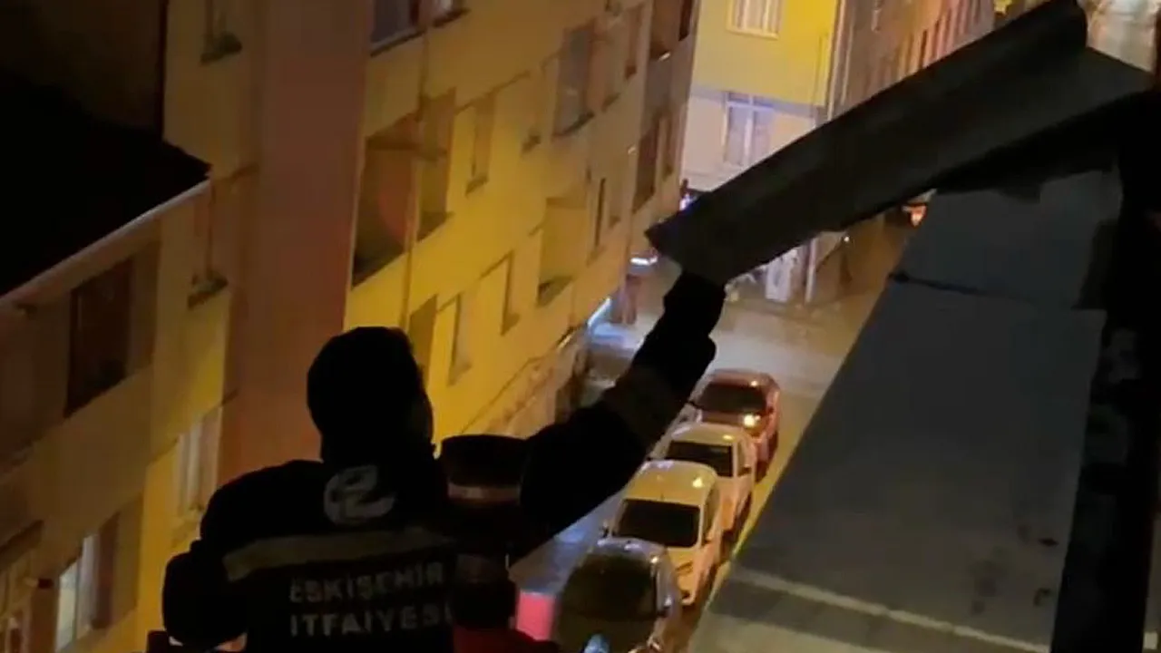 Eskişehir'de dün gün boyu etkili olan şiddetli fırtına gece saatlerinde de tehlike saçmaya devam etti Eskibağlar Mahallesi'nde 5 katlı bir binadan sarkan metal parça, itfaiyenin gece operasyonuyla yerinden kaldırıldı.