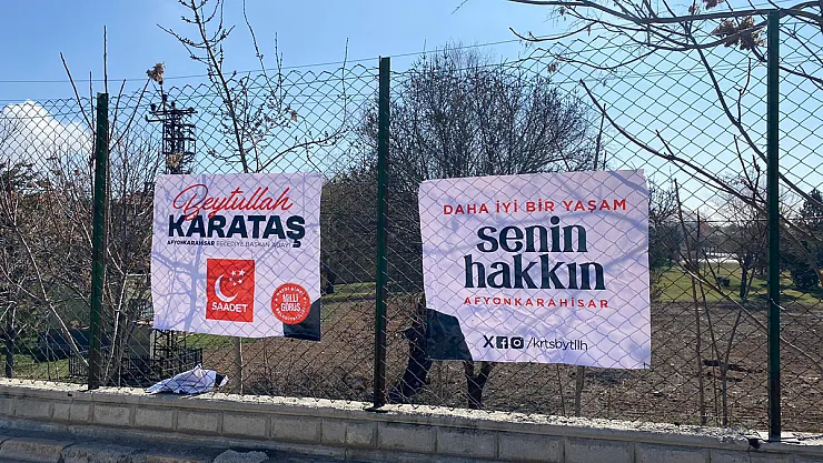 Saadet Partisi Afyonkarahisar Belediye Başkan Adayı Beytullah Karataş, kendisinin pankartını parçalayanlara seslendi. Karataş, 'Canları sağ olsun. Biz bu pankartları diğer partiler gibi devletten hazine yardımı alarak, belediye imkânlarını kullanarak değil kendi imkânlarımızla asıyoruz. Bilinsin isterim.' dedi.