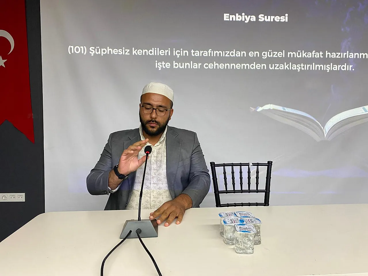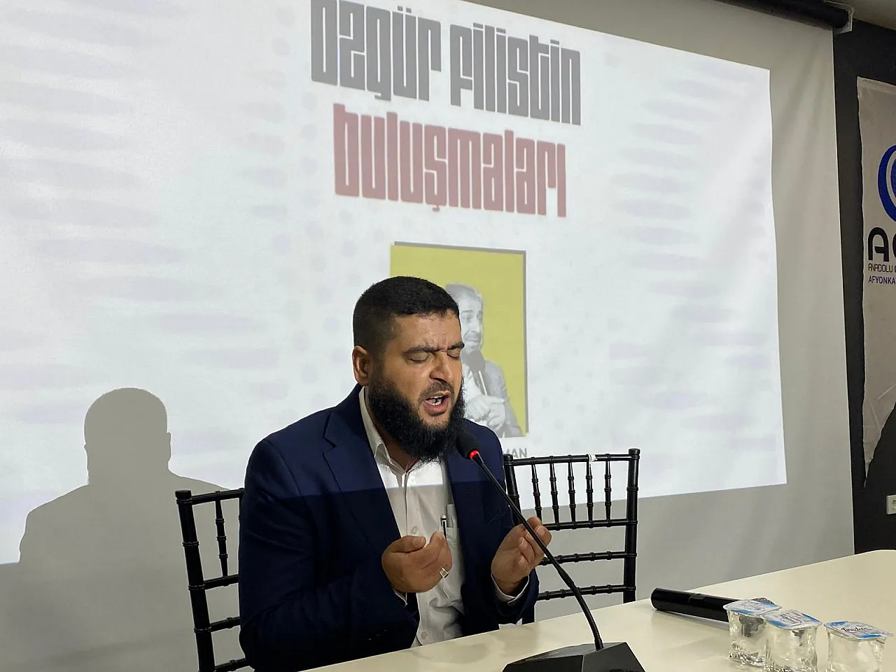Konferans programı Zübeyir İnci’nin gerçekleştirdiği Kur’an-ı Kerim tilavetiyle başladı. Ardından Anadolu Gençlik Derneği (AGD) Afyonkarahisar Başkanı Muharrem Coşkun tarafından açış konuşması yapıldı. Sözlerine, “Yüce Rabbimiz Kur'an-ı Kerim'de buyurur ki, ‘Allah yolunda öldürülenlere ölüler demeyiniz. Nitekim onlar diridirler. Ancak siz fark etmezsiniz, bilemezsiniz.” ifadeleriyle başlayan Coşkun, “Bugün ölümleriyle, şehadetleriyle bütün bir dünyayı ayağa kaldıran, dirilten, vicdanları körelmiş bir insanlığı uyandıran bir topluluğun temsilcisi olarak Dr. Teysir Süleyman hocamızı buraya davet ettik. İnşallah bugün Gazze'de yaşananları birebir müşahede etmiş olan bir insanın dilinden orada yaşanan sıkıntıları öğrenmiş olacağız. Zaten içimizde bir yangın var. Belki yemek yediğimizde yemiş olduğumuz o lokmalar boğazımıza düğümleniyor olabilir. Evlatlarımızı severken orada yaşanan acılar aklımıza gelip evlatlarımızı sevemiyor olabiliriz. Ancak sözden öte fiiliyatın olması gerektiği bir zaman içerisindeyiz. Merhum Mehmet Akif'in Çanakkale şehitleriyle alakalı ‘Bedrin aslanları ancak o kadar şanlı idi’ ifadesinin bir daha ete kemiğe büründüğü bir dönemden geçiyoruz. Yeryüzünün tüm zalimlerinin bir araya gelip bir avuç Müslüman'ı yok etme ile alakalı gecelerini gündüzlerine katarak neredeyse 720 gündür yani 2 yılı aşkın süredir maalesef ki bir soykırım yaşanıyor. Bu soykırıma destek verenler var. Bu soykırıma sessiz kalanlarla beraber, bu soykırıma karşı çıkanlar var. İlk grup muhakkak kaybetmişlerdir. Hangi dine mensup oldukları, hangi ırktan oldukları hiç önemli değil. Ancak buna mukabil bu zulme karşı olan, sesini yükselten, bu acıları kabul etmediğini, elinden gelse orada gidip şehit olacağını deklare eden bir grup var. İnşallah burada bulunan hazirun da, buraya gelmek isteyip de gelemeyen insanlar da o gruba dâhildirler. Şunları da ifade etmeden geçemeyeceğim. Oradaki mücadele bizim buradan yapacağımız hem maddi hem de manevi desteklerle devam ediyor. Oradaki insanlar yokluk içerisinde, yoksulluk içerisinde bir mücadele yapıyorlar, bir kıyam gösteriyorlar ve yeryüzünün en büyük süper güçlerini dize getirmişler Elhamdülillah. Ama bu mücadelenin devam edebilmesi için, Müslümanların onurunun, izzetinin, şerefinin ayaklar altına alınmaması için ve Mescid-i Aksa'nın ve işgal edilmiş topraklarının özgürleştirilmesi için bizim buradan özellikle maddi destek sağlamamız gerekiyor. Bakın şu anda aramızda Uşak’tan kalkıp bu programa iştirak etmek için, kıymetli hocamızı dinlemek için aramızda bulunan kardeşlerimiz var. Yetmedi Rize'den kalkıp buraya gelen ve emanetlerini teslim eden kardeşlerimiz var. Hepinizin huzurlarına onlara teşekkür ediyorum. Allah onlardan razı olsun. Kardeşlerimiz kapının önünde ufak bir yardım toplamak için bir sandık kurdular. Buradaki emanetler direkt hocamıza teslim edilecek. Mücahit komutanımıza teslim edilecektir inşallah. Allah şimdiden yapacağınız hayırları kabul etsin. Rabbim cihat sevabı yazsın.” dedi.